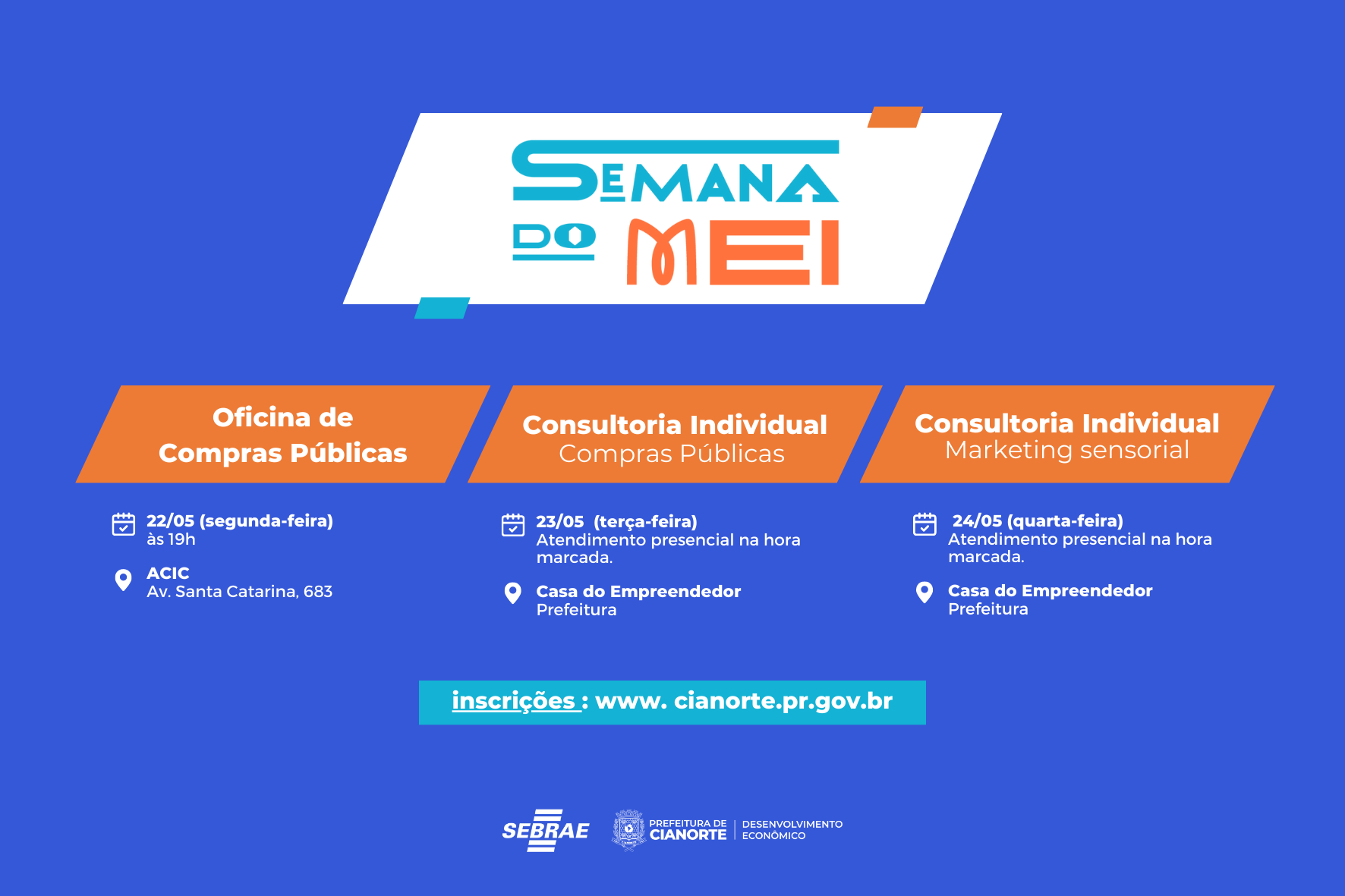 No período da Semana do MEI, haverá reforço do atendimento aos microempreendedores para a regularização de dívidas, declaração DASN-SIMEI e esclarecimento de dúvidas em geral. A Casa do Empreendedor está localizada no Paço Municipal, no primeiro piso, com atendimento de segunda a sexta-feira, das 8h30 às 17h. Confira, ainda, a programação on-line do Sebrae: https://sebrae.com.br/sites/PortalSebrae/MEI/eventosonline.