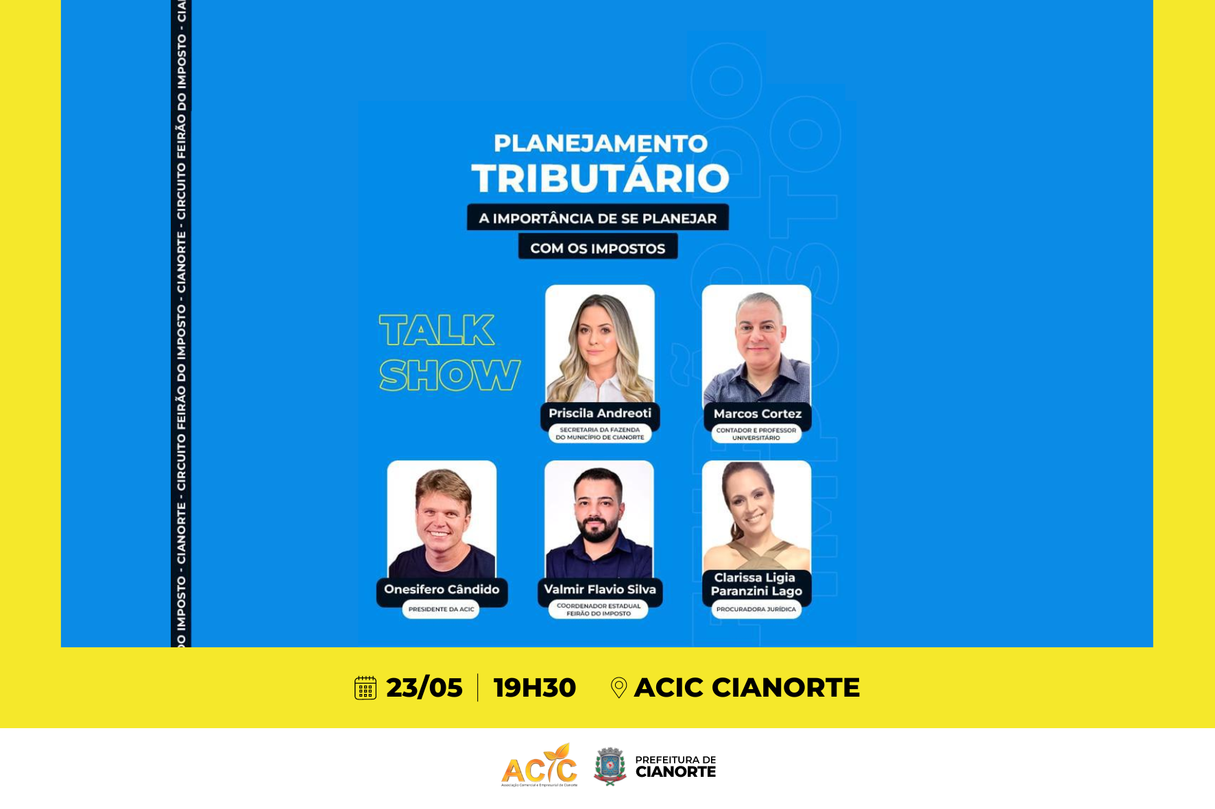 O Talk Show contará com a participação especial do presidente da ACIC, Onesifero Cândido; da Secretária Municipal da Fazenda, Priscila Andreoti; do Coordenador Estadual do Feirão do Imposto, Valmir Flavio Silva; do representante do Núcleo de Contadores, professor Marcos Cortez; e da Procuradora Jurídica do município, Clarissa Paranzini Lago. As inscrições são gratuitas e podem ser feitas no link https://forms.gle/i1tsijCGPxHjGaVX6.