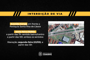 Nesta sexta-feira (19), a partir das 7h, o trecho da Avenida Coruja em frente a Paróquia Santa Rita de Cássia (na altura do número 672) será interditado no sentido bairro/centro. Já a partir das 18h, ambos os sentidos serão interditados. Isto porque, no sábado (20) e domingo (21), o espaço recebe a tradicional Festa de Santa Rita. Os desvios deverão ser realizados pelas ruas Eunildo Stevanato, Maria Domingos, Sabiá e Beija-Flor ou, ainda, pela Avenida Francisco Jorge Nacle.