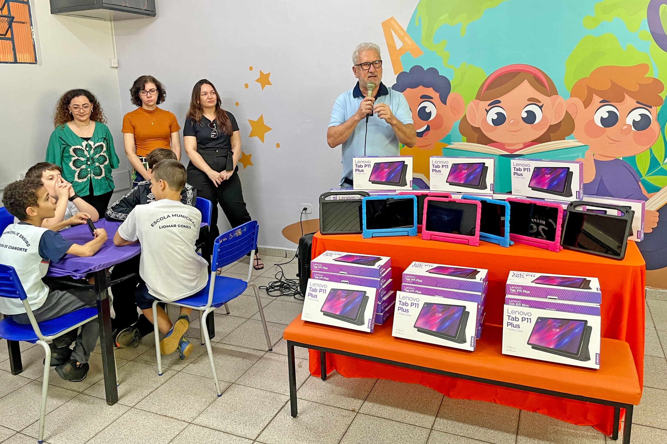 Com o objetivo de tornar o ensino em sala de aula mais dinâmico e atrativo, a Rede Municipal de Ensino recebeu R$ 943.976,16 em equipamentos eletrônicos, sendo tablets, armários/ carregadores (laboratórios móveis), notebooks e projetores. Na tarde desta quinta-feira (25), o prefeito, Marco Franzato, esteve na Escola Municipal Liomar Gomes para oficializar a entrega dos dispositivos.