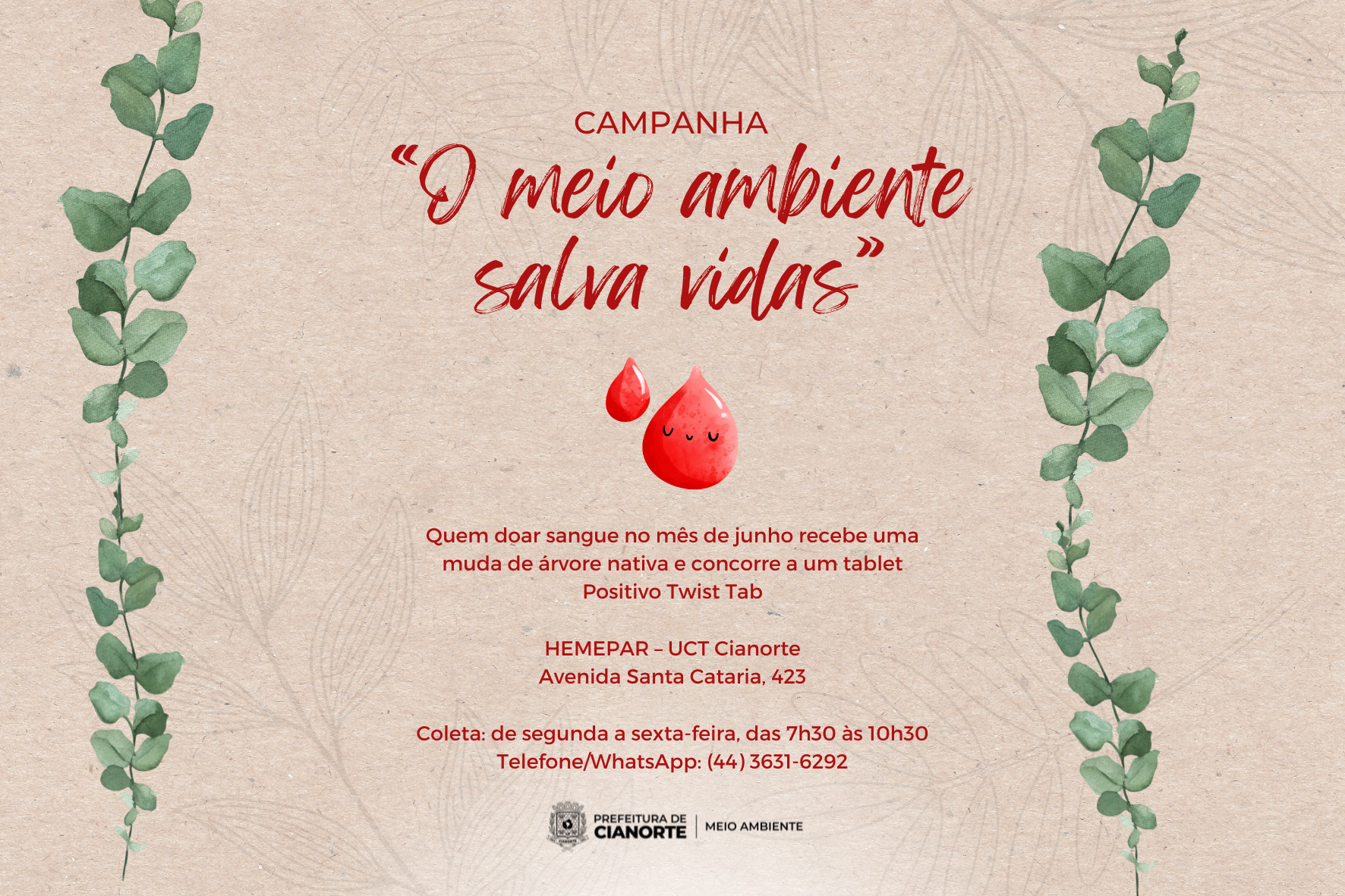 Um novo mês se inicia nesta quinta-feira (1º) e, com isso, o período dedicado ao fortalecimento da sensibilização ambiental (Junho Verde) e da doação de sangue (Junho Vermelho). Unindo as duas iniciativas, a Secretaria Municipal de Meio Ambiente e Bem-Estar Animal, em parceria com a 13ª Regional de Saúde, promove a campanha “O meio ambiente salva vidas”: durante estes 30 dias, quem doar sangue na Unidade de Coleta e Transfusão do Hemepar em Cianorte receberá uma muda de árvore nativa e integrará o sorteio de um tablet Positivo Twist Tab.