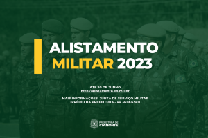 Os jovens do sexo masculino que completam 18 anos em 2023 devem se alistar para o Serviço Militar Obrigatório. O período de inscrições começou em 2 de janeiro e segue até 30 de junho. O procedimento é simples e pode ser realizado on-line, por meio do site alistamento.eb.mil.br, ou presencialmente, na sede da Junta Militar de Cianorte, localizada no segundo piso da Prefeitura, com atendimento de segunda a sexta-feira, das 8h30 às 12h e das 13h30 às 17h. É preciso apresentar o RG, CPF e comprovante de endereço.