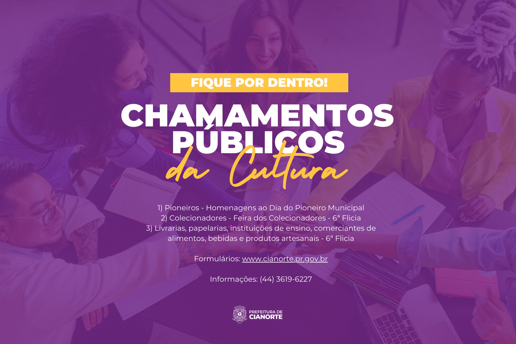 Cianorte comemora 70 anos no dia 26 de julho. Para celebrar a importante data, a Prefeitura organiza uma série de eventos ao longo do mês. Entre eles, o Dia do Pioneiro Municipal, também celebrado na data, e a 6ª Festa Literária de Cianorte – Flicia, que terá as atividades ao longo da primeira quinzena. Para garantir a participação da comunidade, de forma gratuita, a Secretaria Municipal de Cultura organizou três Chamamentos Públicos.