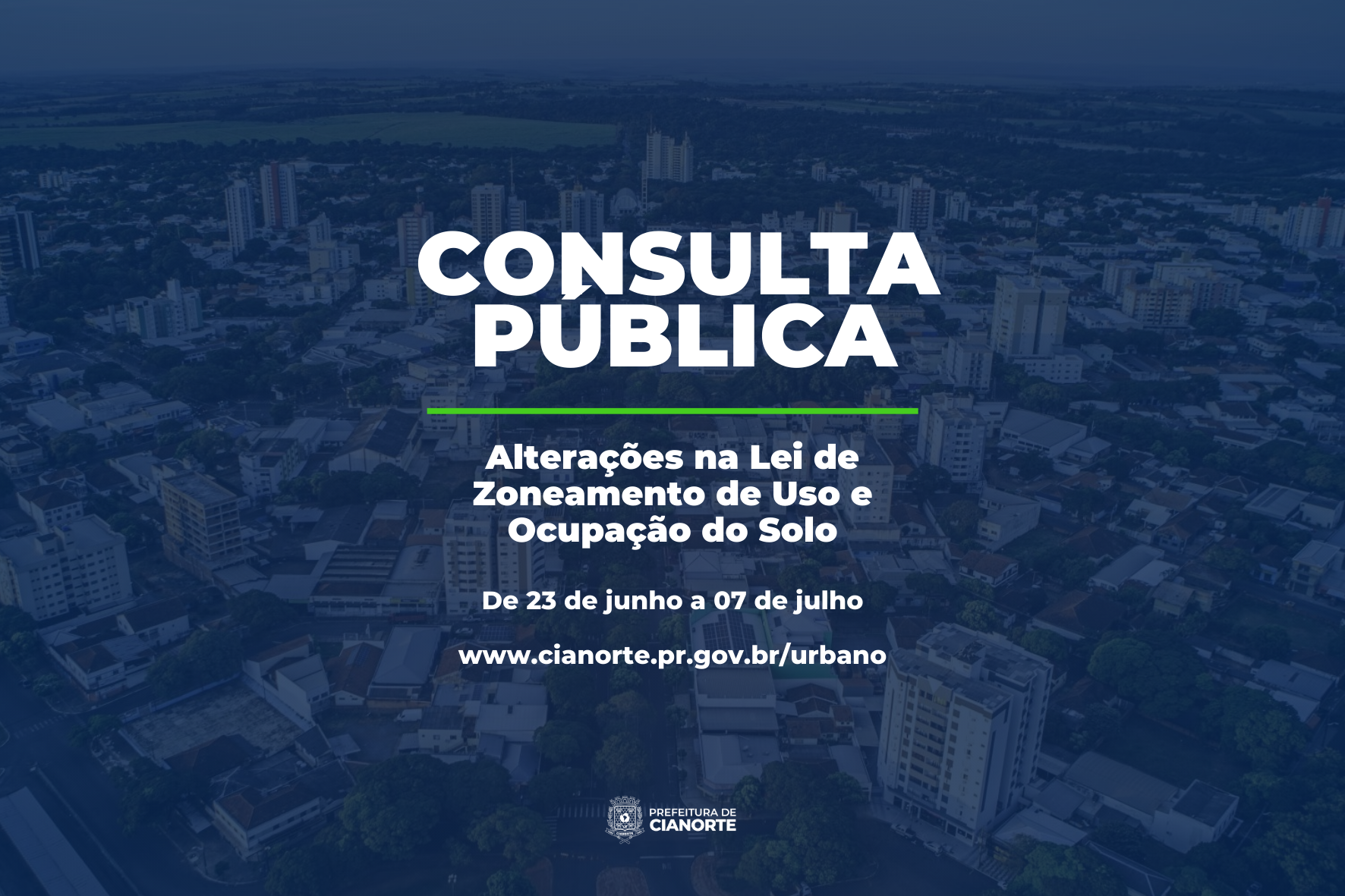 A Secretaria Municipal de Desenvolvimento Urbano convida a população a opinar nas alterações que serão realizadas nos mapas da Lei Complementar nº 177/2022, a Lei de Zoneamento de Uso e Ocupação do Solo. A consulta pública será on-line, entre os dias 23 de junho e 07 de julho, com acesso pelo banner localizado na página da secretaria no site da Prefeitura (www.cianorte.pr.gov.br/urbano). No local, é possível visualizar a proposta de mapa de zoneamento e também o formulário para requerer/sugerir alterações.