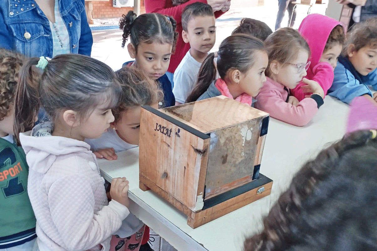 As instituições que participam do projeto receberam caixas que servem de abrigo para as abelhas, onde formam a colônia, doadas pelos membros do grupo Abelhas Fonte de Vida. Foram instaladas 16 unidades na Jardim Aeroporto e 17 na Castro Alves. As espécies escolhidas foram Jataí, Mandaçaia e Mirim. “Nesta primeira fase, os voluntários Márcio Ferreira da Silva, Cristina Kozempa, Sebastião Garcia, João Paulo Rossi, acompanhados do Adenir Volpato, apresentaram esses animais sem ferrão para os estudantes. Com a utilização de caixas didáticas, de vidro, os alunos aprenderam desde a organização da colônia, até como capturá-las e fazer a retirada consciente do mel. Ficamos muito satisfeitos com o interesse e engajamento dos professores e alunos”, comentou Márcio.