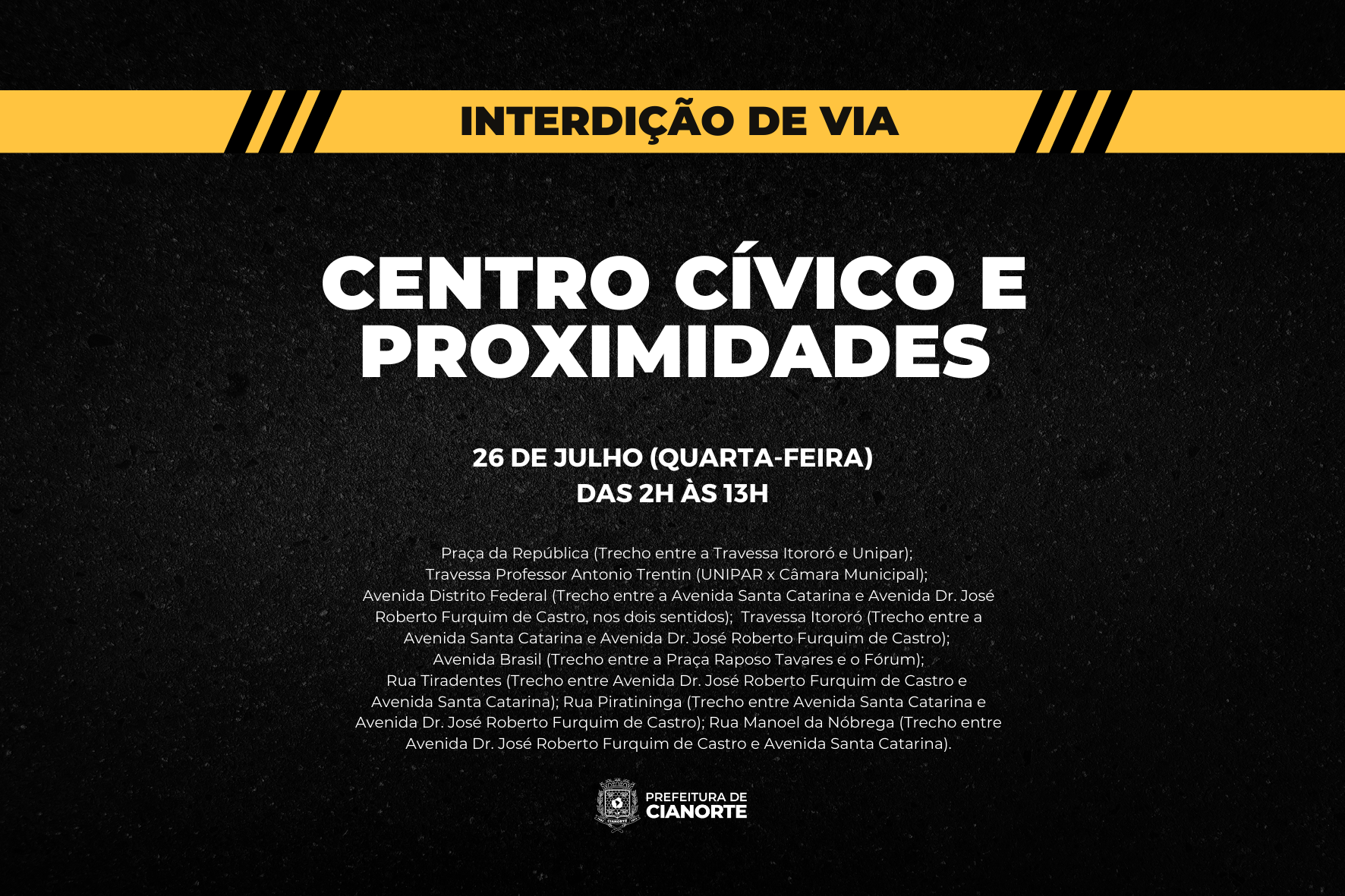 A Prefeitura, por meio da Secretaria Municipal de Cultura e da Diretran, informa a interdição de trechos no entorno do Centro Cívico, nesta quarta-feira (26), em decorrência do tradicional desfile cívico do aniversário da cidade que, em 2023, completa 70 anos. Os bloqueios terão início na madrugada, às 2h, com liberação prevista para as 13h, nas seguintes vias: