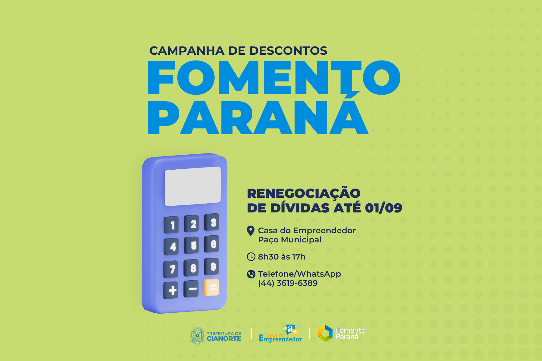 Clientes da Fomento Paraná que estejam inadimplentes, com parcelas de empréstimos em atraso, por exemplo, têm até 1º de setembro para renegociar os contratos com condições facilitadas para colocar as contas em dia. A campanha oferece descontos que podem chegar a 100% dos juros e encargos moratórios, extensão do prazo de pagamento para até 60 meses e carência de 60 dias para retomada dos pagamentos.