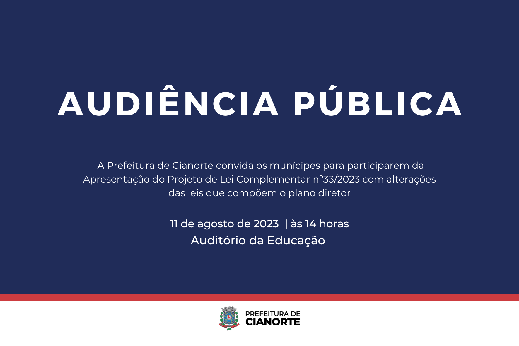A população de Cianorte tem um importante compromisso nesta sexta-feira (11). Trata-se da Audiência Pública para a apresentação do Projeto de Lei Complementar nº 33/2023, que prevê alterações nas leis que compõem o Plano Diretor. A iniciativa será às 14h, no auditório da Prefeitura.