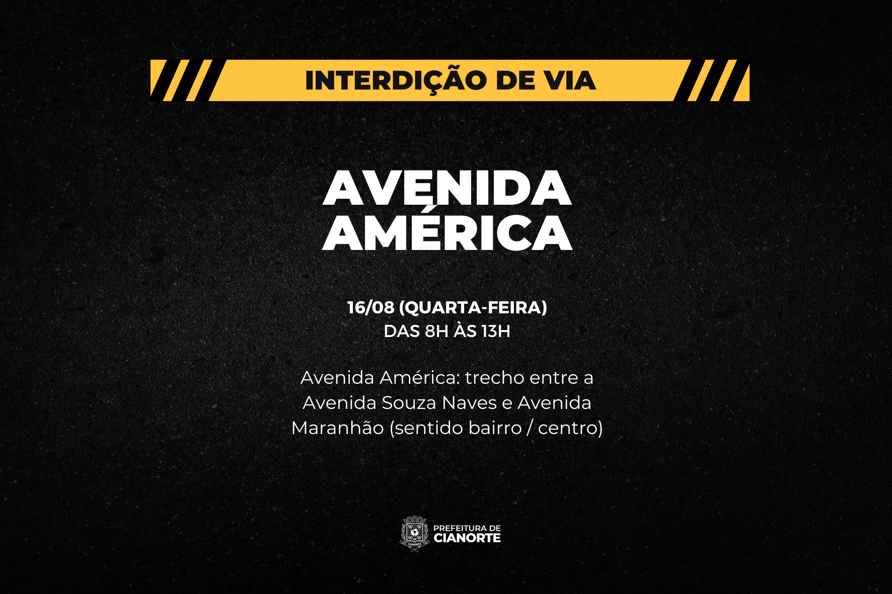 Na manhã desta quarta-feira (16), o trecho da Avenida América entre a Avenida Souza Naves e a Avenida Maranhão será interditado, no sentido bairro / centro, para realização de obras pela Sanepar.