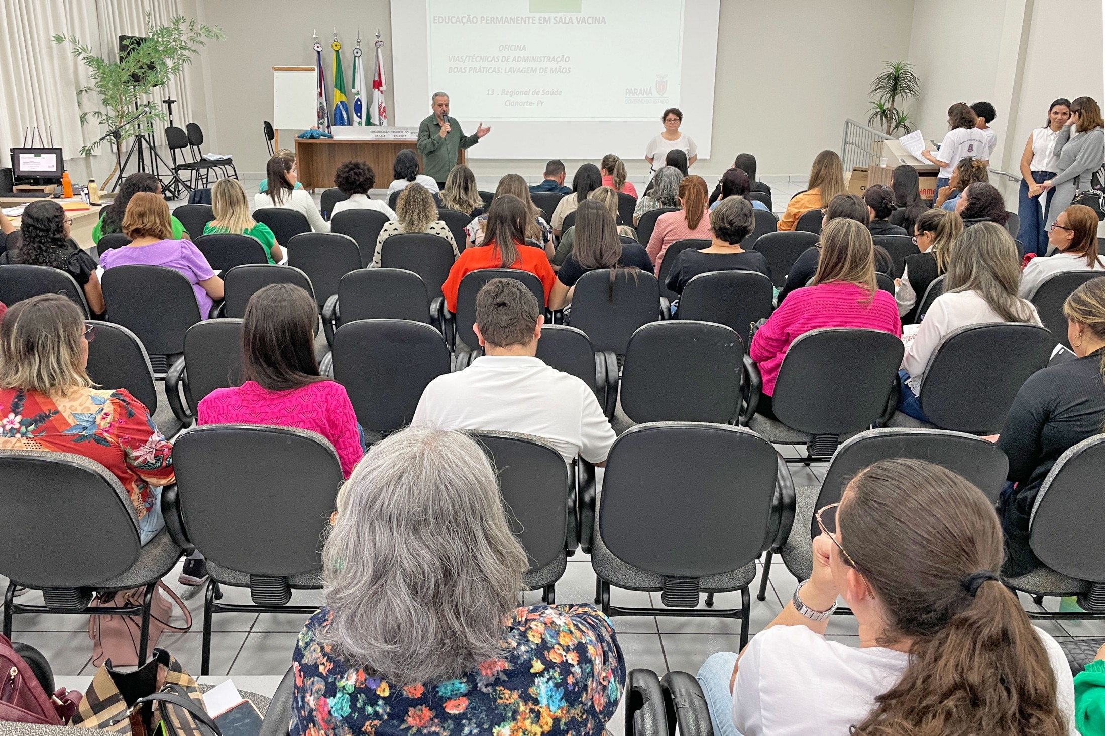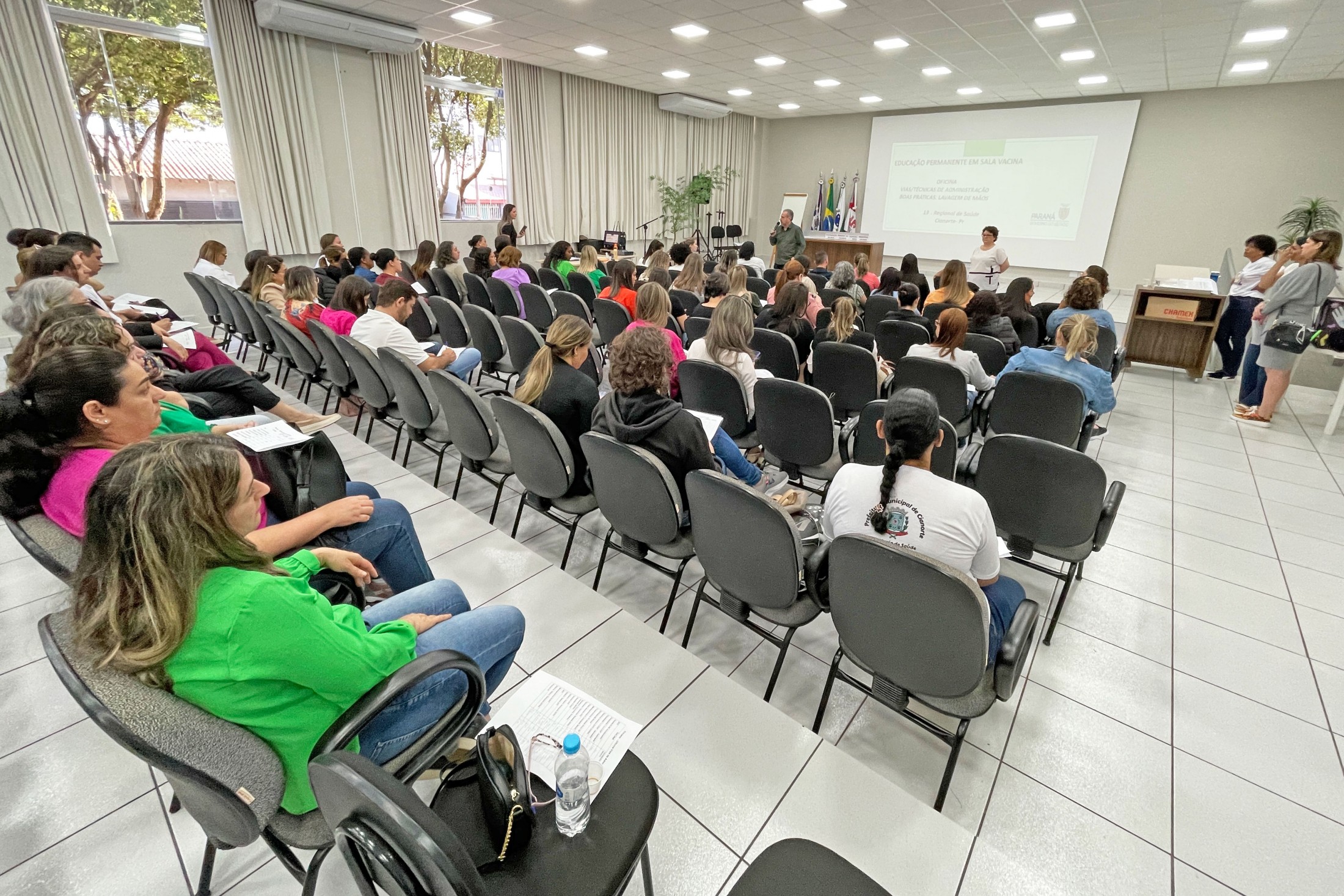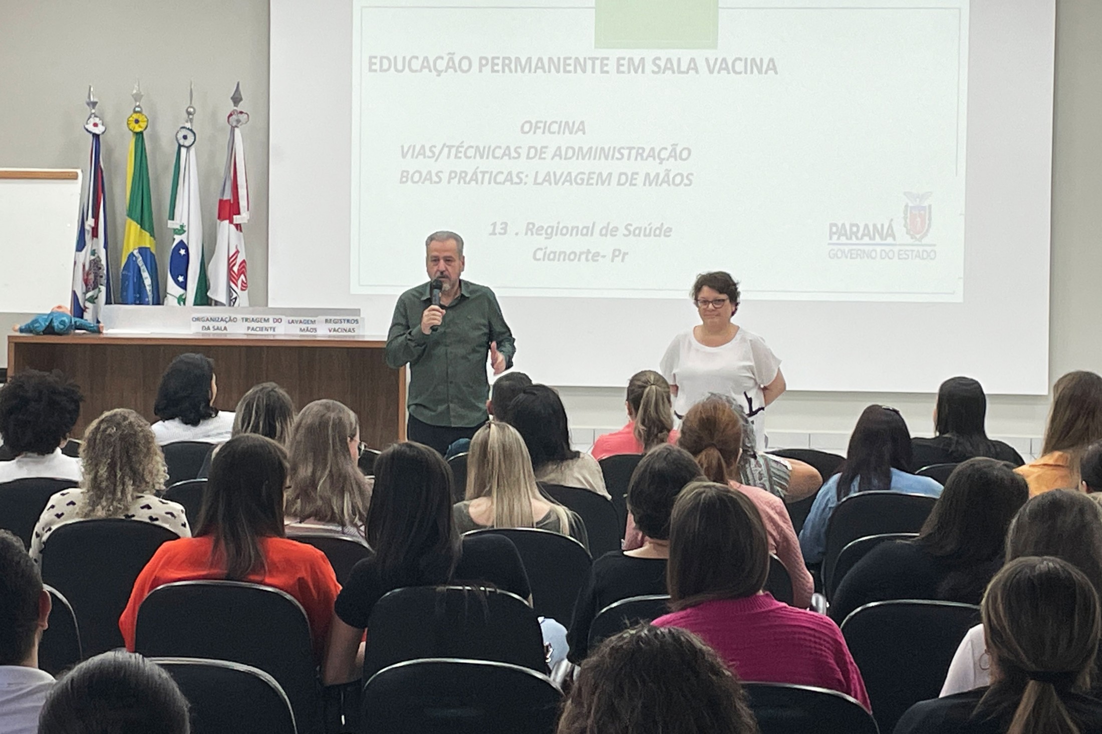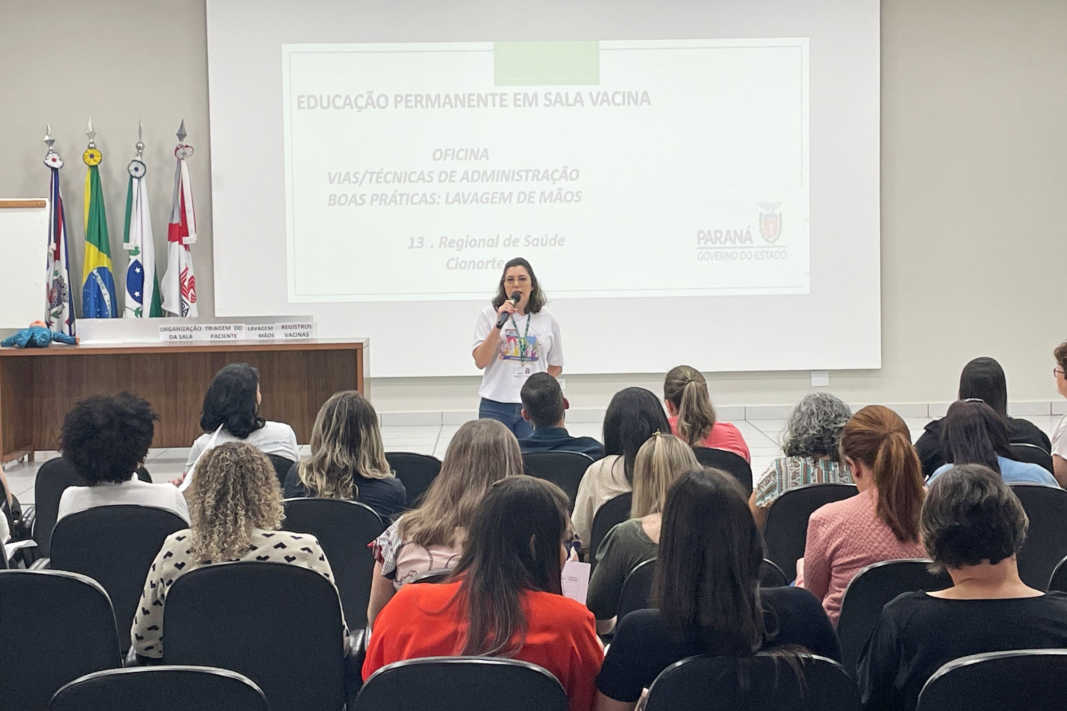 Os profissionais que atuam nas salas de vacinas nos 11 municípios pertencentes à 13ª Regional de Saúde estiveram reunidos, nesta quinta-feira (17), no auditório da Unipar, na “Educação Permanente para Sala de Vacina e Rede de Frio”. Com o tema “Vias/Técnicas de Administração - Boas práticas de lavagem de mãos”, o encontro foi conduzido pelos profissionais de Cianorte, Tânia Mara de Almeida, Dalila Pereira da Silva, Sabrina Vasconcelos Mendes e Bazani Albanezi.
