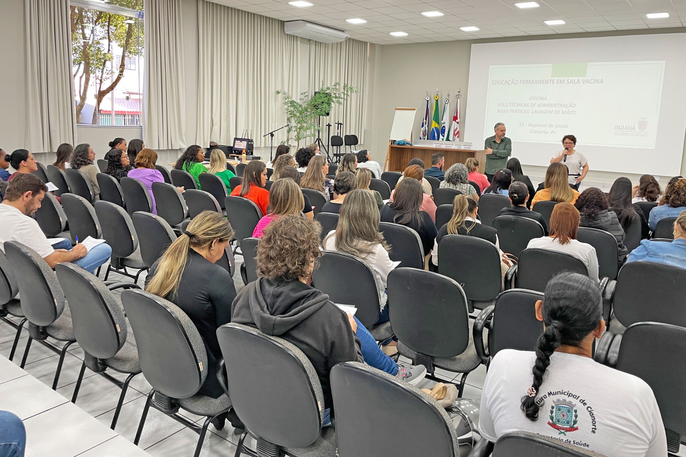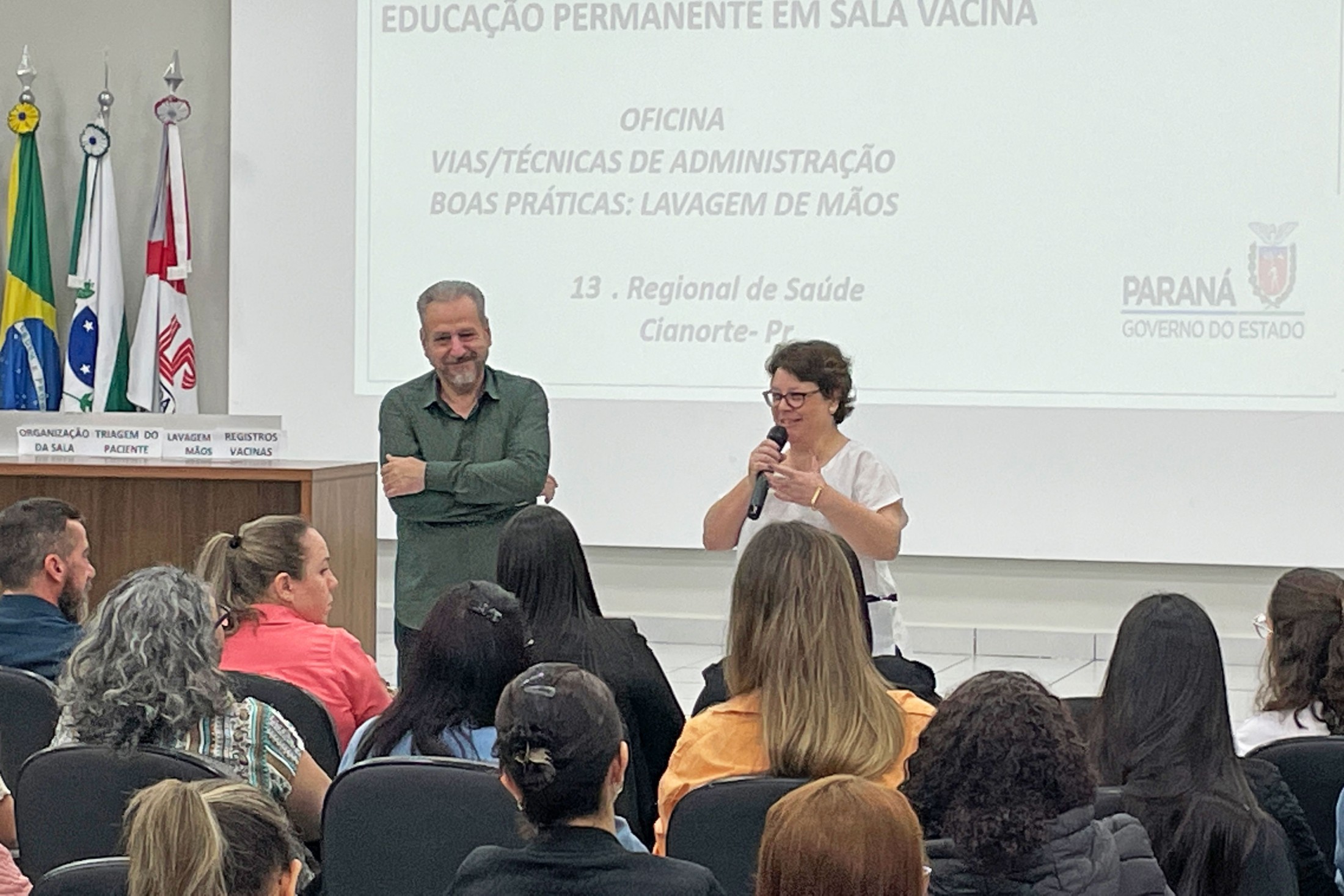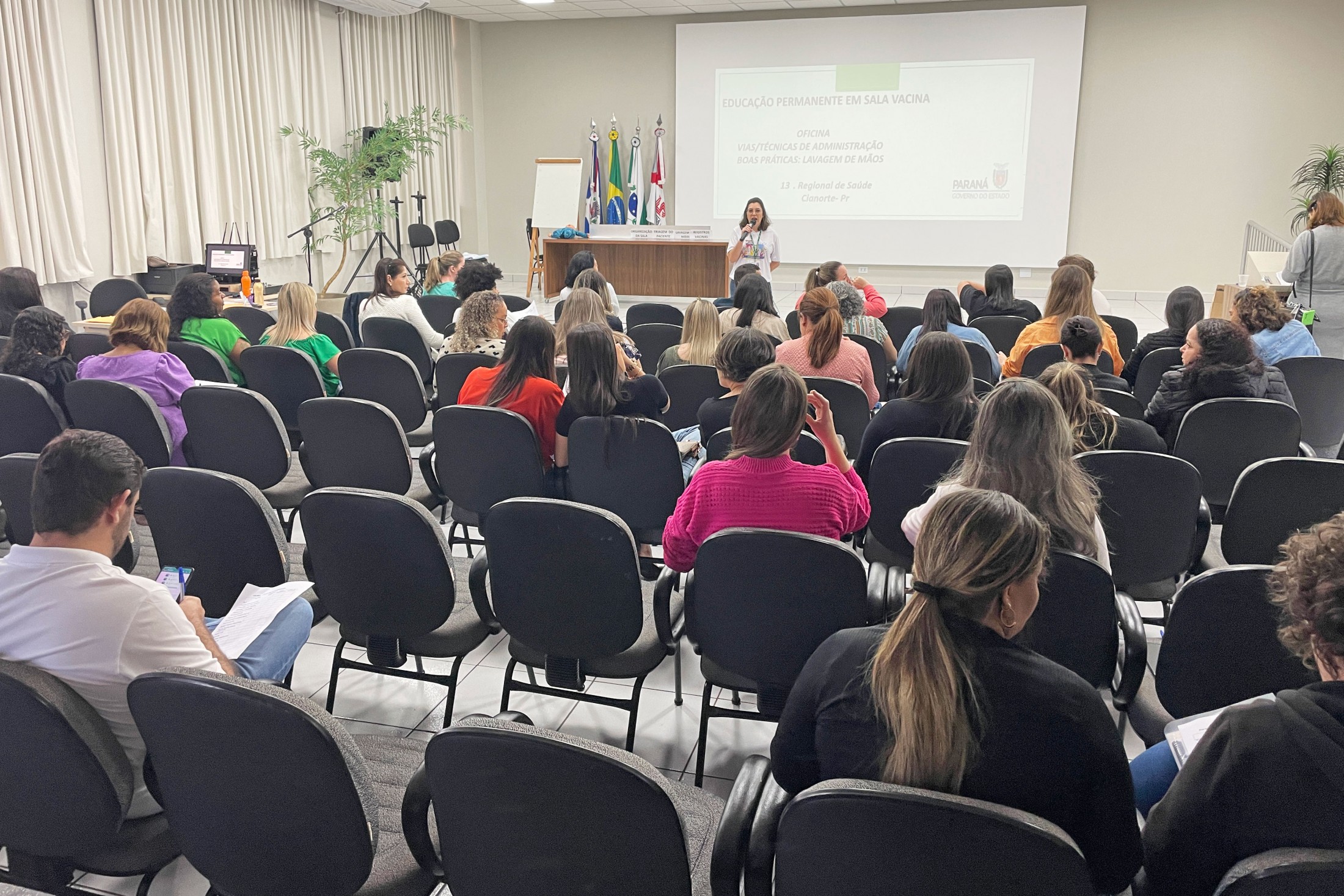 Os profissionais que atuam nas salas de vacinas nos 11 municípios pertencentes à 13ª Regional de Saúde estiveram reunidos, nesta quinta-feira (17), no auditório da Unipar, na “Educação Permanente para Sala de Vacina e Rede de Frio”. Com o tema “Vias/Técnicas de Administração - Boas práticas de lavagem de mãos”, o encontro foi conduzido pelos profissionais de Cianorte, Tânia Mara de Almeida, Dalila Pereira da Silva, Sabrina Vasconcelos Mendes e Bazani Albanezi.