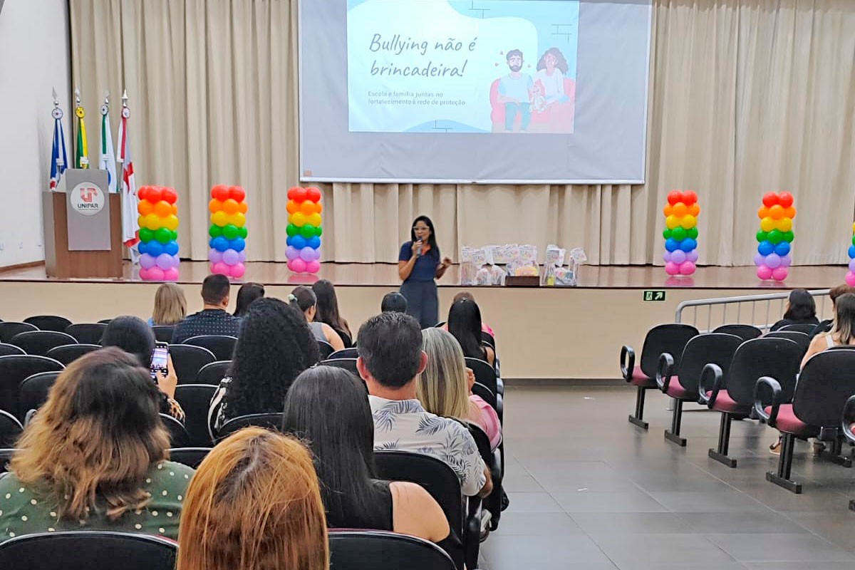 Na quinta-feira (17), além da formação continuada aos educadores e aos professores, foi realizada uma visita técnica no Centro Municipal de Educação Infantil (CMEI) São Francisco de Assis e na Escola Municipal Gonçalo Moreno Gutierres, para verificar o uso do material didático e conversar com as crianças, profissionais e equipe gestora das instituições. Já no período noturno, no Teatro Cândido Garcia (Unipar), aconteceu o 2º Encontro com a Família – EFAM 2023. A iniciativa reuniu aproximadamente 70 pais e familiares e tratou do tema “Bullying não é brincadeira!”.