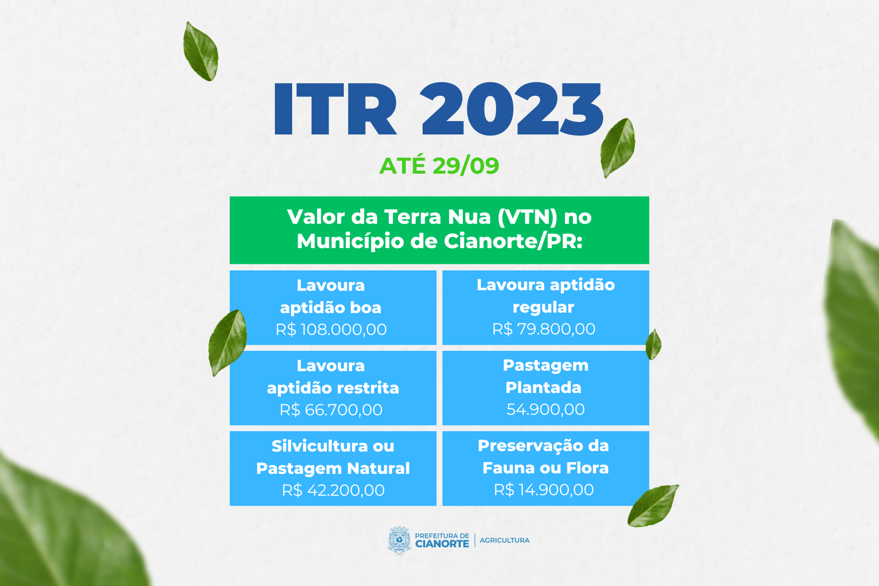 O ITR está disposto na Lei Federal nº 9.393/1996, sendo que as diretrizes para a declaração deste ano constam na Instrução Normativa nº 2.151/2023. O tributo pode ser pago à vista ou parcelado em até quatro vezes iguais, mensais e consecutivas, com exceção do imposto de valor inferior a R$ 100,00 (cem reais) que deve ser em cota única.