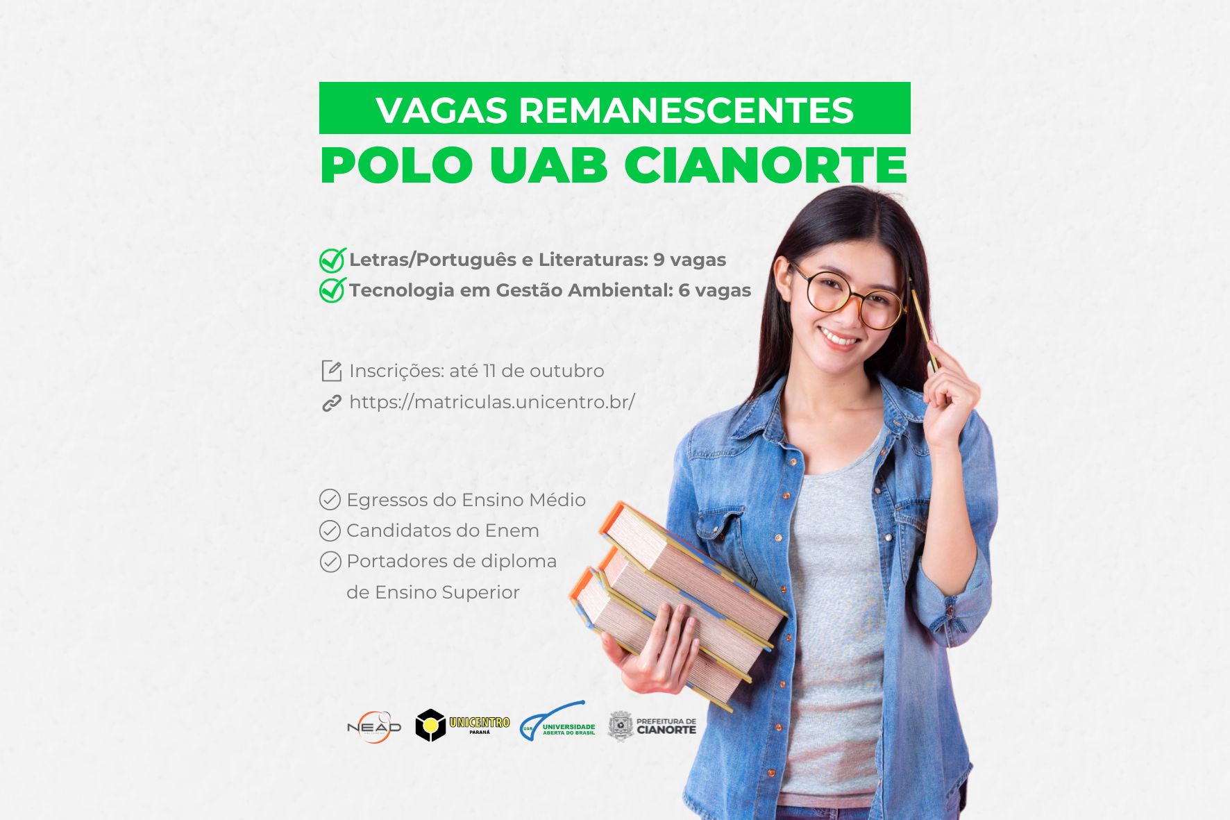 Quem deseja cursar o ensino superior, na modalidade de Educação a Distância (EaD), em uma universidade pública e gratuita não pode perder esta oportunidade: as vagas remanescentes da Unicentro no polo UAB de Cianorte. As oportunidades são para a licenciatura em Letras/Português e suas Literaturas (9 vagas) e Tecnologia em Gestão Ambiental (6 vagas). As inscrições já estão abertas e seguem até 11 de outubro, pelo site https://matriculas.unicentro.br/inscricoes/.