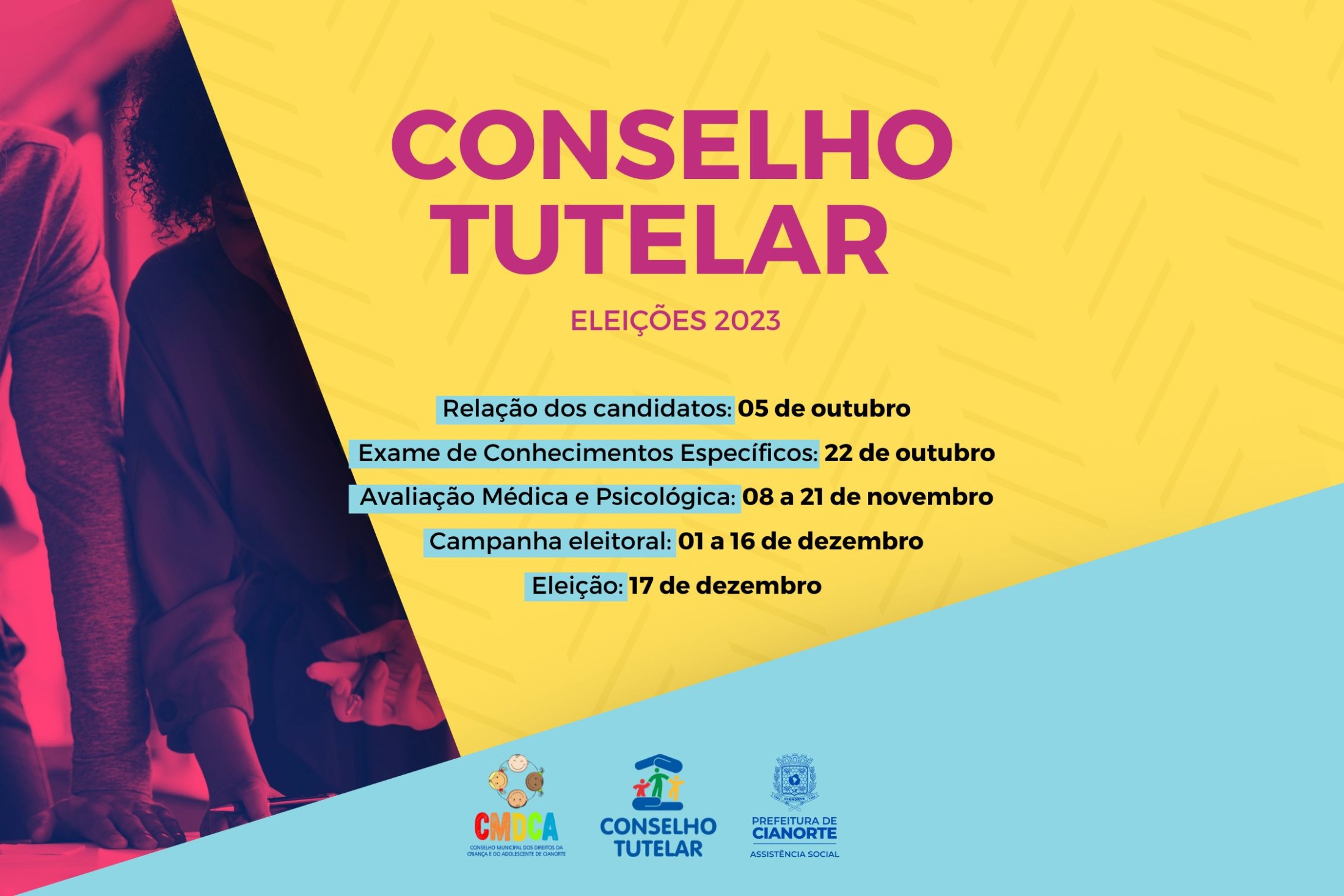 O Conselho Tutelar de Cianorte é composto por cinco membros efetivos e um suplente para cada. O Processo de Escolha abrange: Inscrição, Avaliação Documental, Exame de Conhecimentos Específicos, Avaliação Médica e Psicológica, Eleição e Curso de Formação Inicial. Todas as etapas têm caráter eliminatório. No momento, está sendo aguardada a publicação, no Órgão Oficial do Município (https://cianorte.pr.gov.br/diario-oficial/), da Relação Definitiva de Candidatos, prevista para esta quinta-feira (5). O Exame de Conhecimentos Específicos está marcado para 22 de outubro. Na sequência, o período de Avaliação Médica e Psicológica vai de 08 a 21 de novembro. A campanha eleitoral ocorre de 1º a 16 de dezembro.