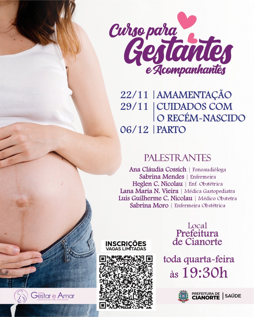 A Secretaria Municipal de Saúde, por meio do projeto Gestar e Amar, abriu inscrições para o Curso para Gestantes e Acompanhantes. Serão três encontros, às quartas-feiras, 19h30, no auditório da Prefeitura, a partir do dia 22 de novembro. A participação é gratuita e as inscrições são on-line, pelo formulário disponível no link https://forms.gle/x8nbkFRLfzBhJN5s7.