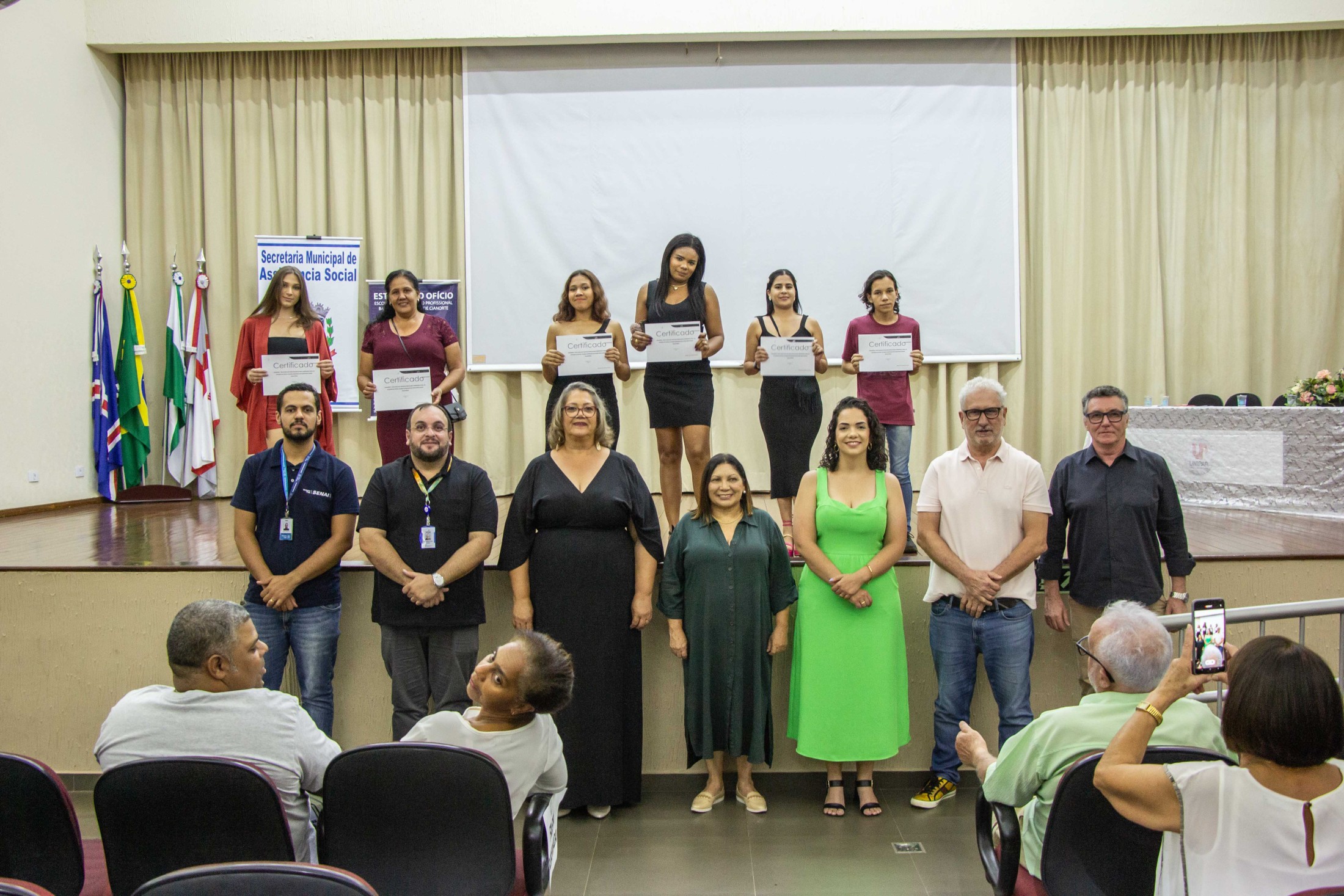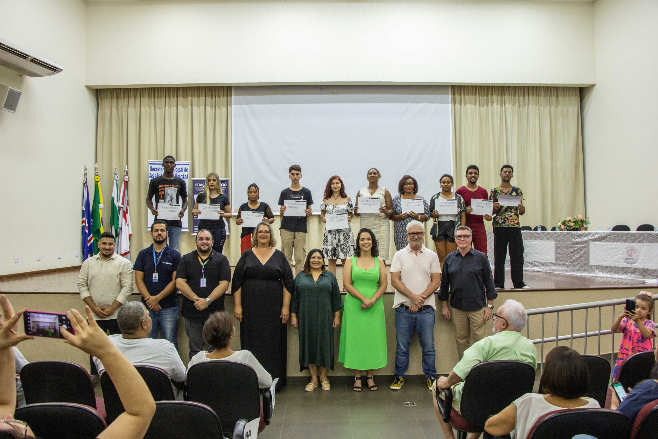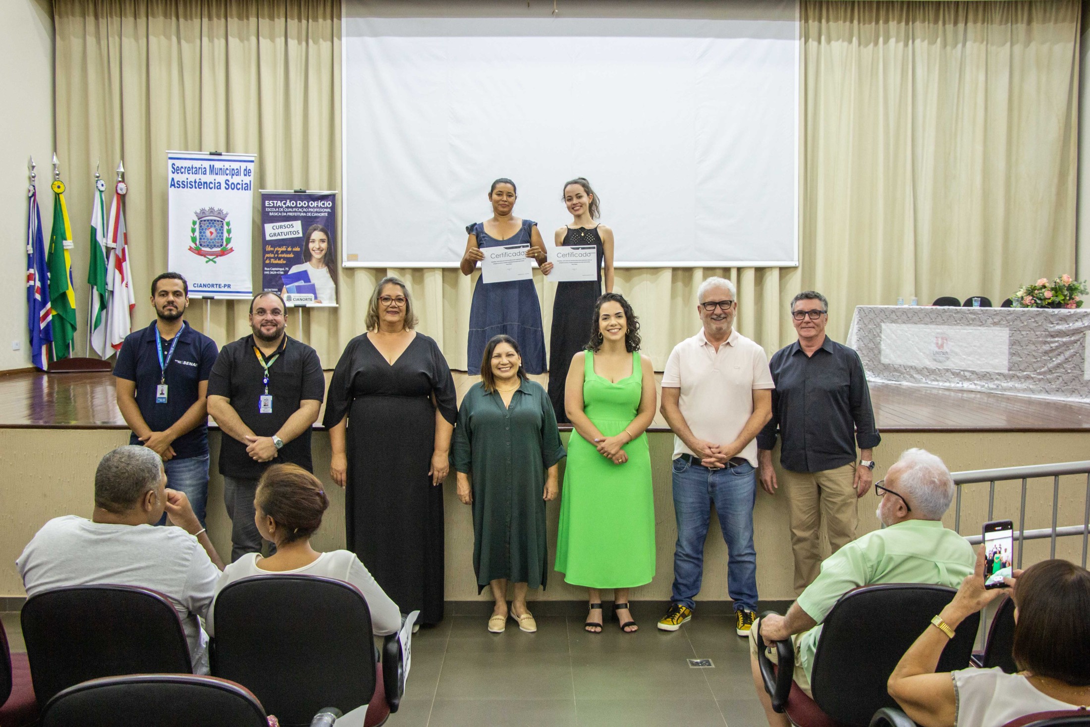 A noite da última quarta-feira (08) foi de muita alegria e satisfação para os concluintes dos cursos oferecidos pela Escola de Qualificação Profissional Básica da Prefeitura de Cianorte, mais conhecida como Estação do Ofício, junto com o SENAI e SENAC. Autoridades, professores, alunos e seus familiares reuniram-se no auditório da Unipar, em uma solenidade seguida por coquetel.