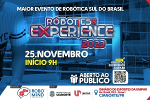 O evento que proporciona experiências práticas e emocionantes com os conceitos da Robótica Educacional, o Robotics Experience, será realizado em Cianorte neste sábado (25), no Complexo Esportivo da Unipar, das 9h às 14h, com entrada aberta ao público. A ocasião será composta por alunos das 15 Escolas Municipais, além de outras instituições de ensino selecionadas pela organizadora, a Robo Mind.