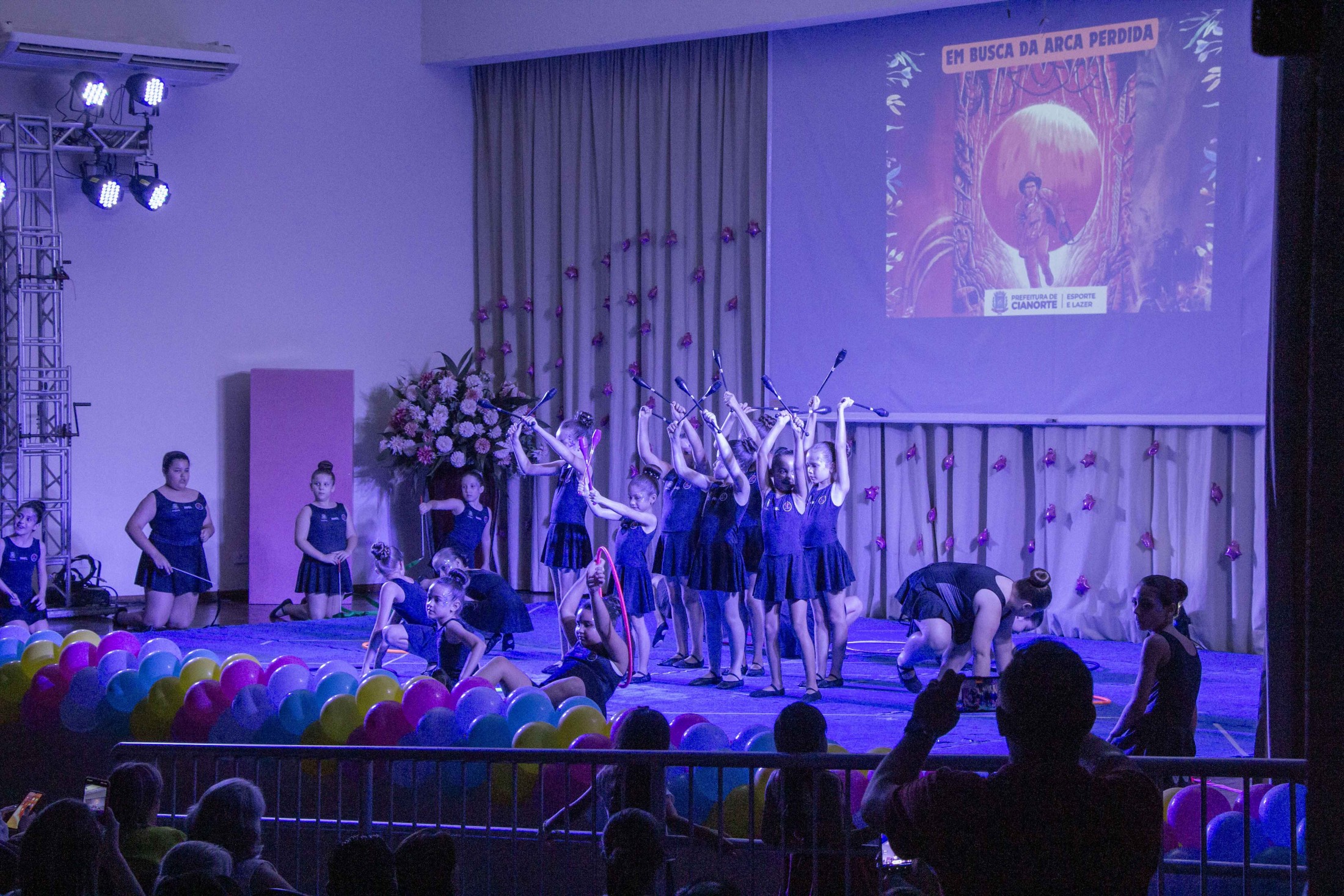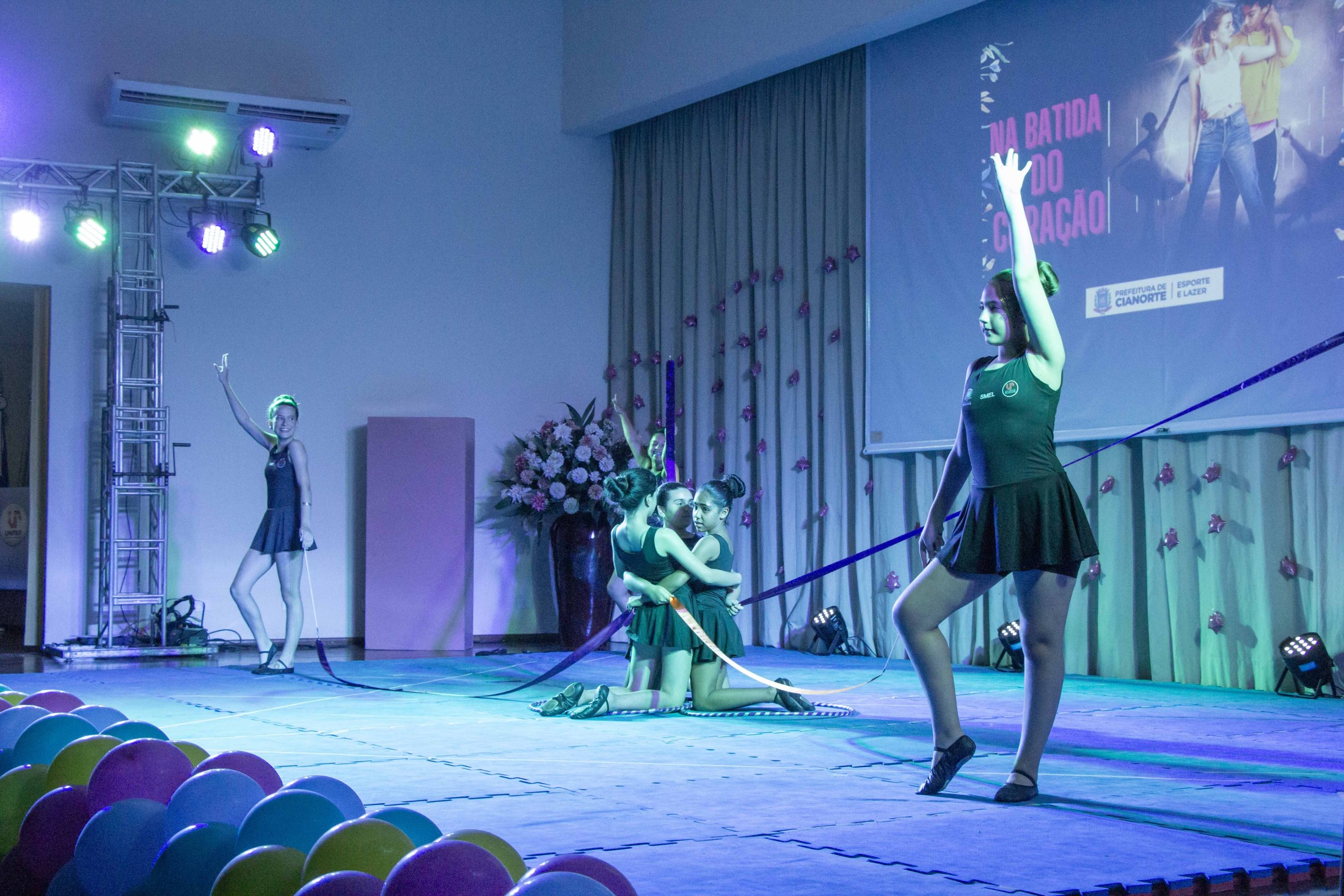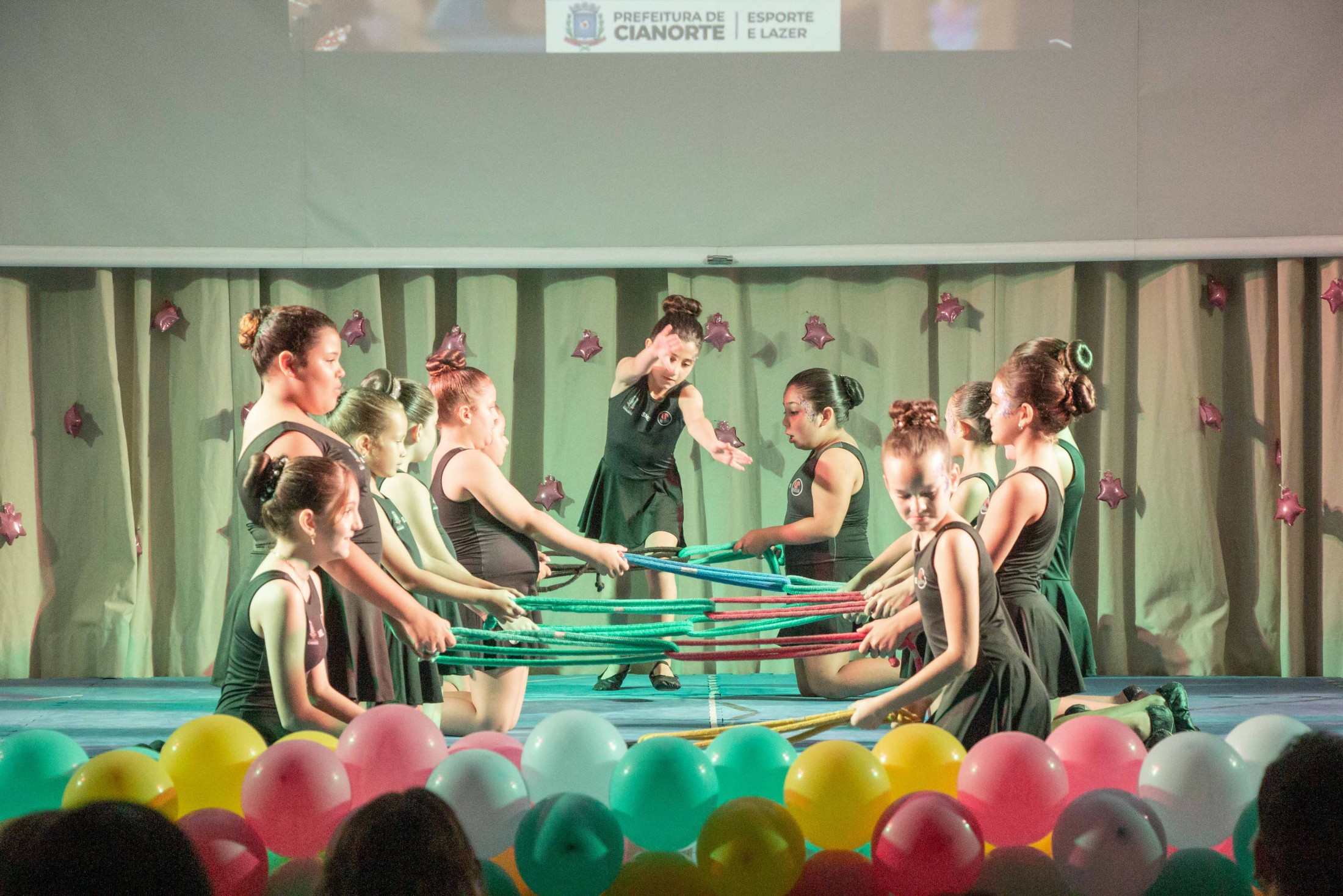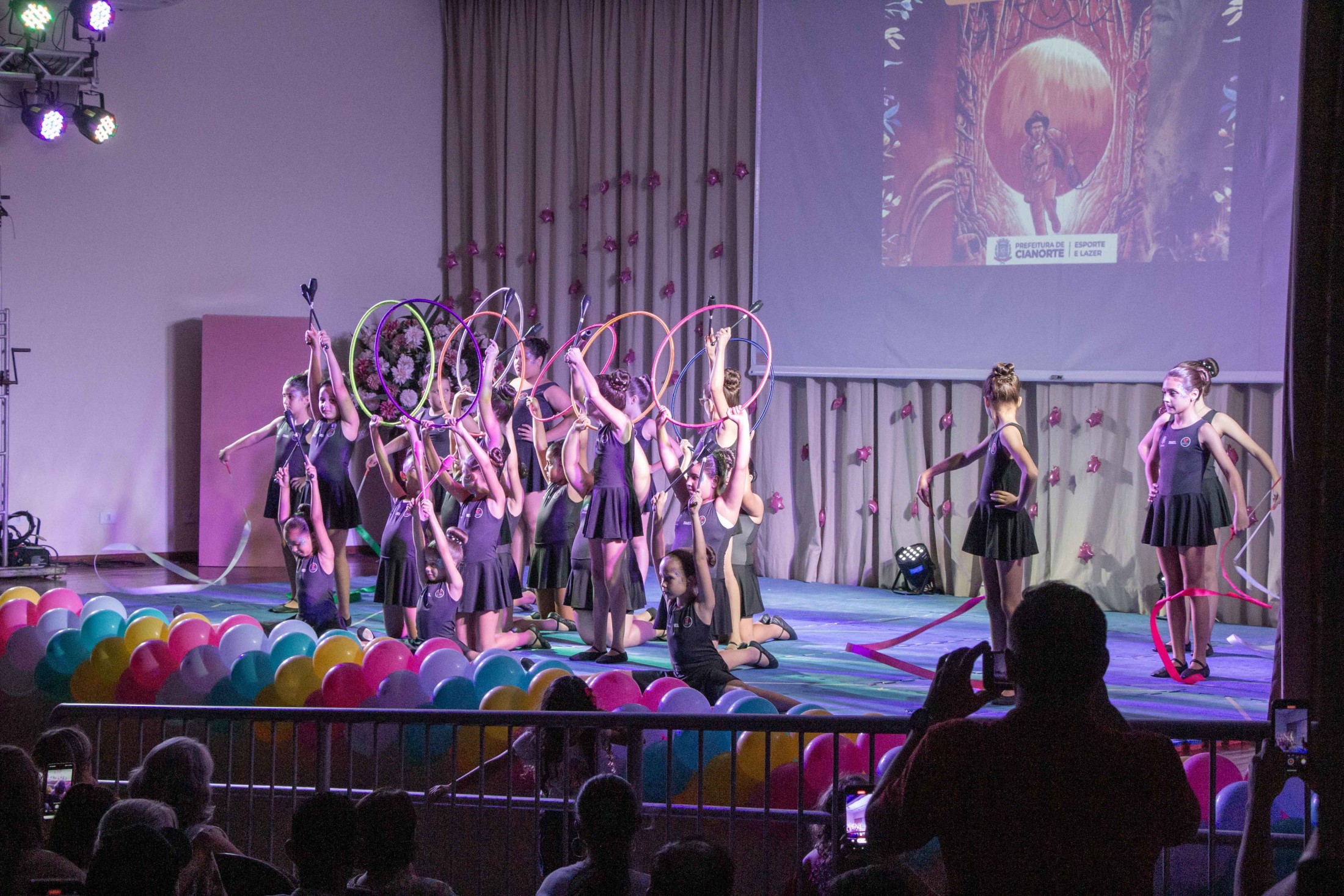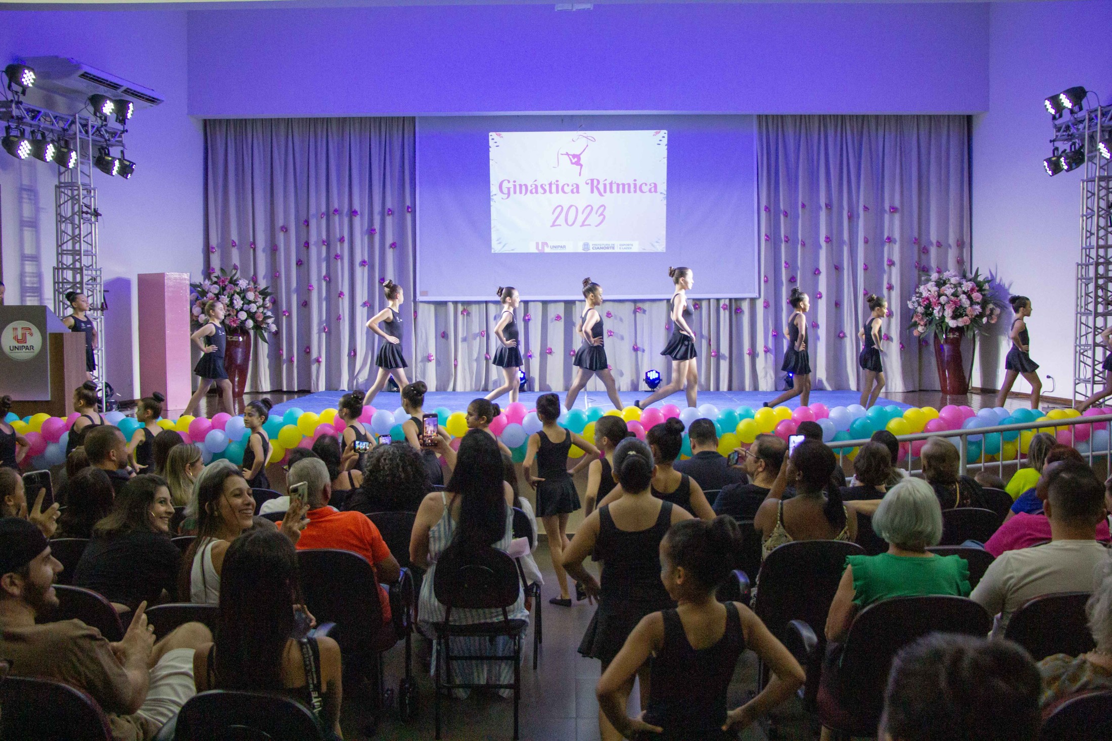Na noite da última terça-feira (12), o Teatro Cândido Garcia ficou lotado com a realização do 3º Festival de Ginástica Rítmica, um projeto da Prefeitura, por meio da Secretaria Municipal de Esporte e Lazer (SMEL), em parceria com a Unipar, que promove aulas gratuitas da modalidade. O evento marcou o encerramento das atividades de 2023, reunindo as 110 alunas, com apresentações das habilidades desenvolvidas, que encantaram o público.