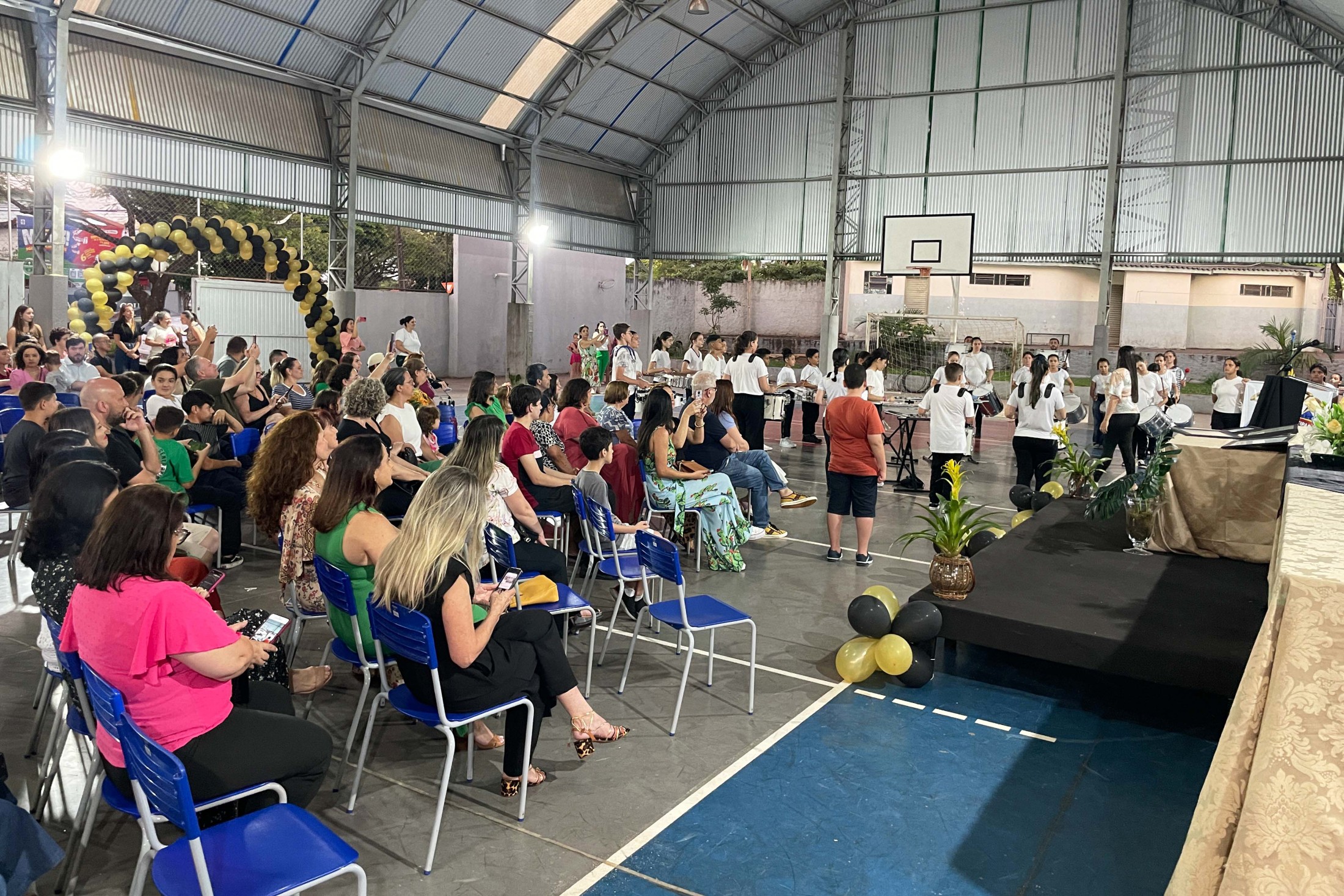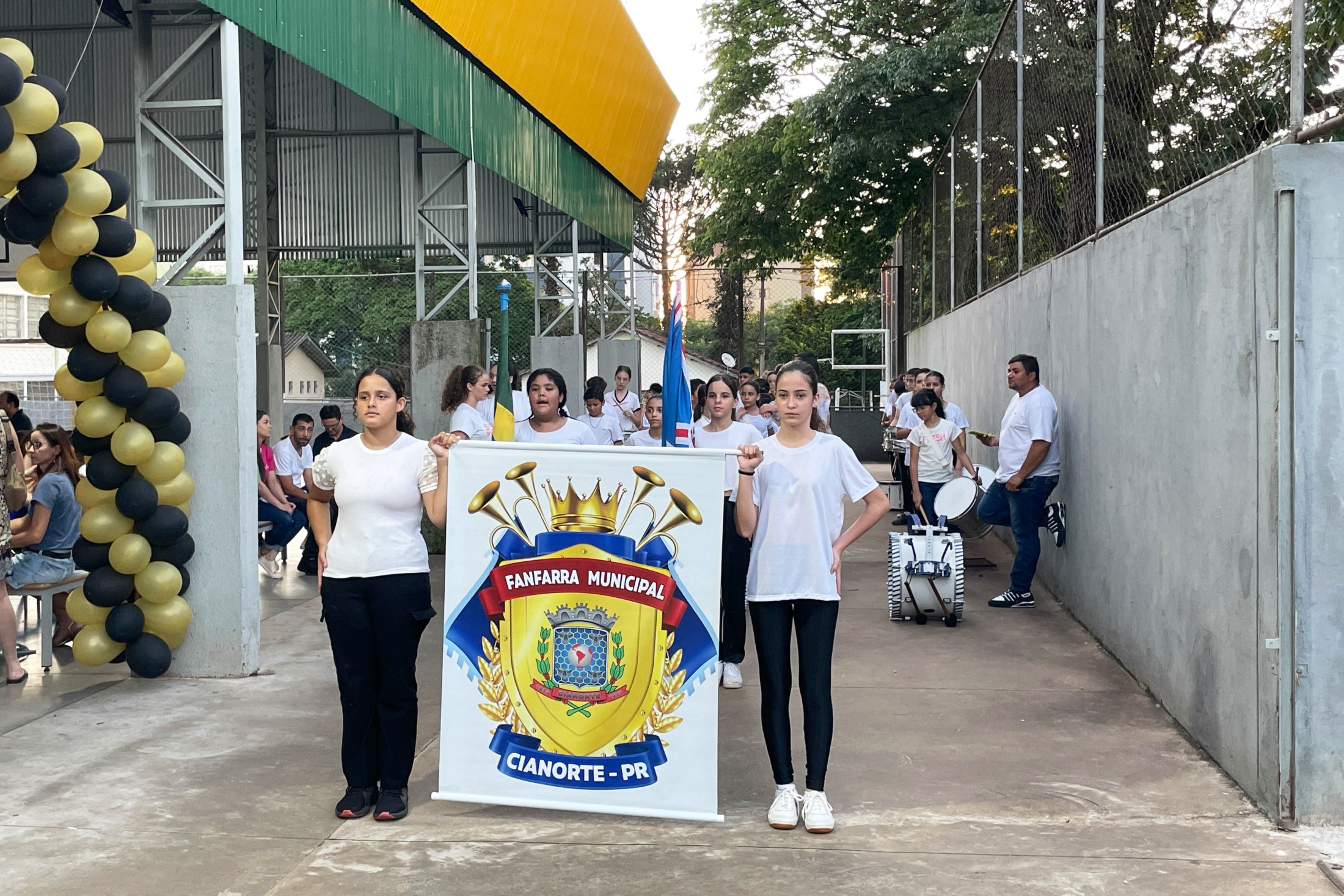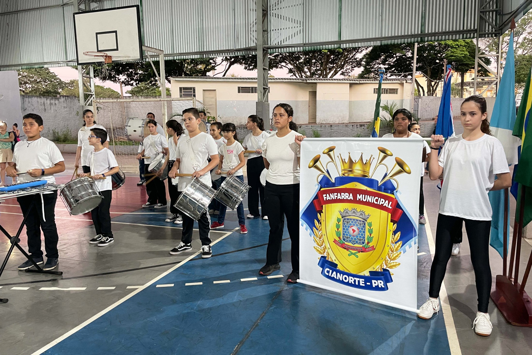 O cerimonial teve continuidade com as apresentações de ginástica "Conjunto Mãos Livres" e "Conjunto Aparelho Arco", do Centro Artístico e Esportivo Thays Pires, e entrega à escola do Voto de Parabéns da Câmara Municipal de Cianorte, pela vereadora, Professora Neuza Casassa. A solenidade contou, ainda, com a presença do vice-prefeito, João Alexandre Teixeira; dos vereadores, Pastor Dejair Barbosa Melo, Márcia Pereira, e Thiago Fontes; do representante do Núcleo Regional de Educação de Cianorte, Marlon Cantarin; da secretária municipal de Educação, Jakeline Plácido Marcon; e do secretário municipal de Cultura, Evandro de Castro.
