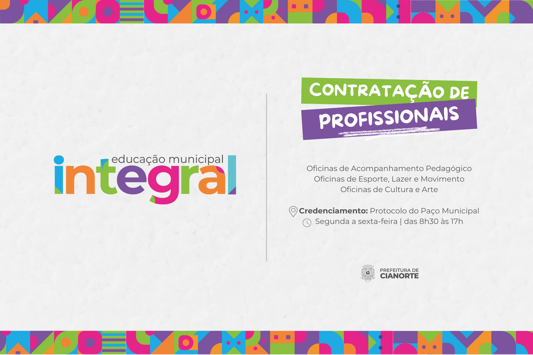 A Prefeitura de Cianorte, por meio da Secretaria de Educação, abriu chamamento público para pessoas físicas e jurídicas (Microempreendedores Individuais - MEIs) interessadas na prestação de serviços nas oficinas de Acompanhamento Pedagógico; Esporte, Lazer e Movimento; e Cultura e Arte. Os contratados atuarão na Educação Municipal Integral, junto aos estudantes do Ensino Fundamental 1.