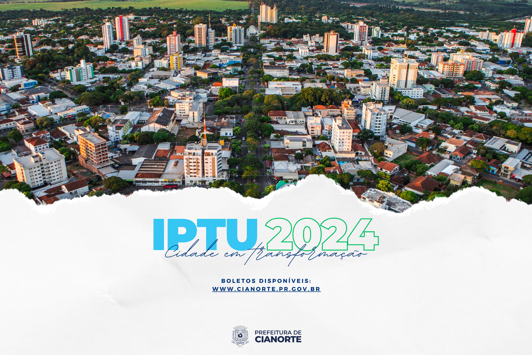 Os proprietários de imóveis em Cianorte já podem consultar os boletos para pagamento do Imposto Predial e Territorial Urbano, o IPTU 2024. A emissão é exclusivamente on-line, pelo site do Município (www.cianorte.pr.gov.br/iptu), na área de Acesso Rápido ou pelo banner rotativo. A pesquisa pode ser realizada pelo CPF, CNPJ ou com o número do cadastro do imóvel.