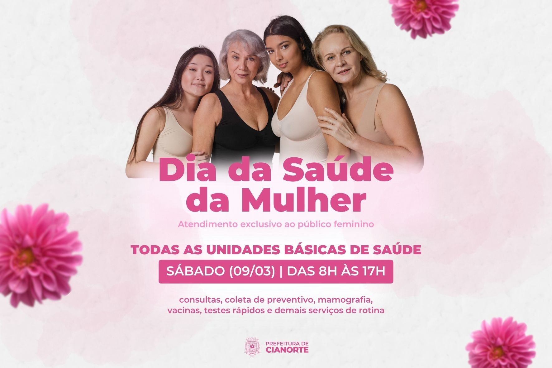 Em Cianorte, assim como nos distritos de Vidigal e São Loureço, o público feminino tem uma oportunidade imperdível de cuidar do bem-estar: o Dia da Saúde da Mulher, neste sábado (09). Todas as Unidades Básicas de Saúde estarão abertas, com atendimento exclusivo, das 8h às 17h. Serão disponibilizadas consultas médicas, coleta de preventivo, mamografia, vacinas, testes rápidos e outros serviços de rotina.