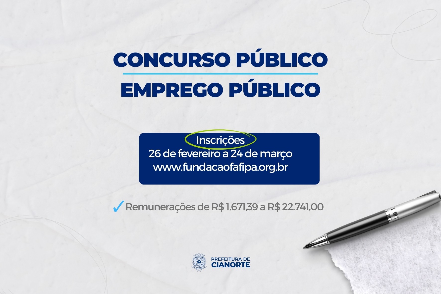 Aqueles que almejam seguir carreira no funcionalismo público municipal ou mesmo num emprego público devem se apressar. Isso porque, terminam no domingo (24) as inscrições para o Concurso Público da Prefeitura de Cianorte, para a contratação de servidores efetivos (estatutários) e de empregados da Administração Pública Municipal (CLT). Os interessados podem se cadastrar no site da responsável pelos certames, a Fundação FAFIPA (www.fundacaofafipa.org.br).
