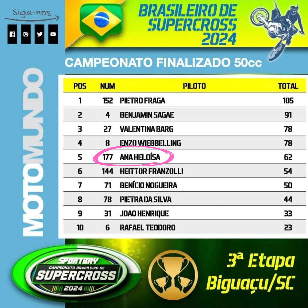 Apesar da pista cheia de obstáculos, curvas acentuadas e seções de terra solta, Ana Heloísa não se intimidou com sua estreia na modalidade e alcançou posição no top 5 do campeonato. “Foi a primeira vez que tive contato com o supercross e, mesmo com o alto nível técnico dos competidores, consegui enfrentar as provas e conquistar bons resultados. Estou muito feliz e agradeço a todos que torceram por mim, assim como aos meus patrocinadores e apoiadores”, avaliou.