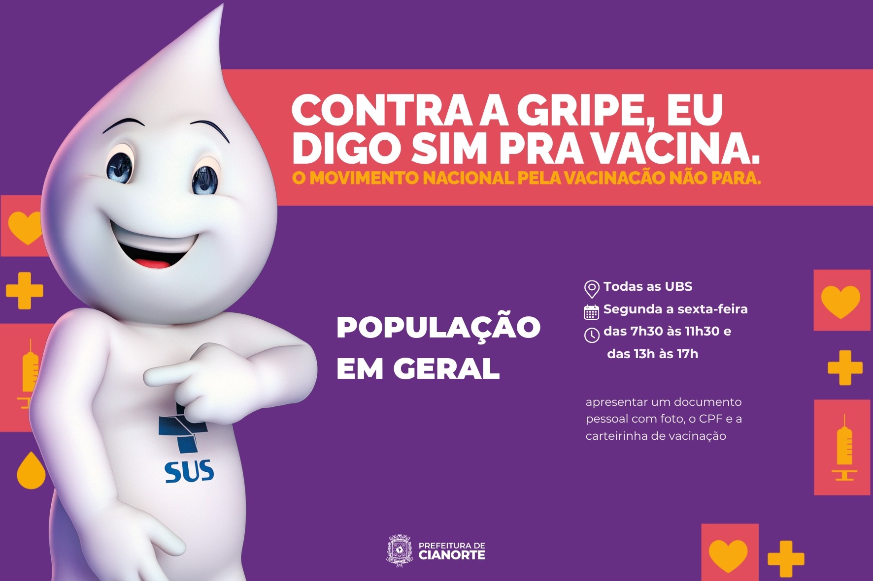 A partir desta quinta-feira (02), todos os cianortenses já podem se imunizar contra a gripe. Isto porque, a tradicional campanha foi expandida para a população em geral (idade acima de seis meses), pela Secretaria de Estado da Saúde (Sesa), conforme as diretrizes do Ministério da Saúde. Para receber a dose, basta comparecer à Unidade Básica de Saúde (UBS) de referência e apresentar um documento pessoal com foto, o CPF e a carteirinha de vacinação. O atendimento é de segunda a sexta-feira, das 7h30 às 11h30 e das 13h às 17h.