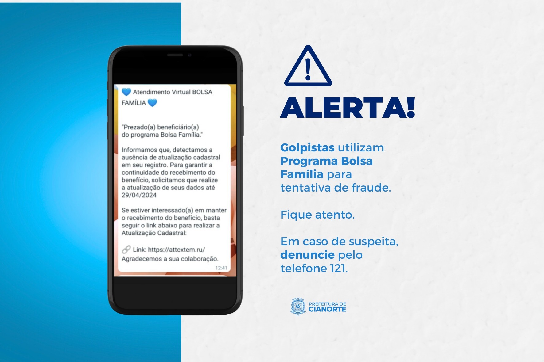 A Secretaria Municipal de Assistência Social de Cianorte alerta a população sobre uma série de golpes que visam fraudar beneficiários do Programa Bolsa Família. Nos últimos dias, uma onda de mensagens de texto falsas, enviadas por SMS, tem sido recebidas pelos cadastrados no auxílio. Também há casos de ligações. São tentativas de capturar informações pessoais e financeiras.