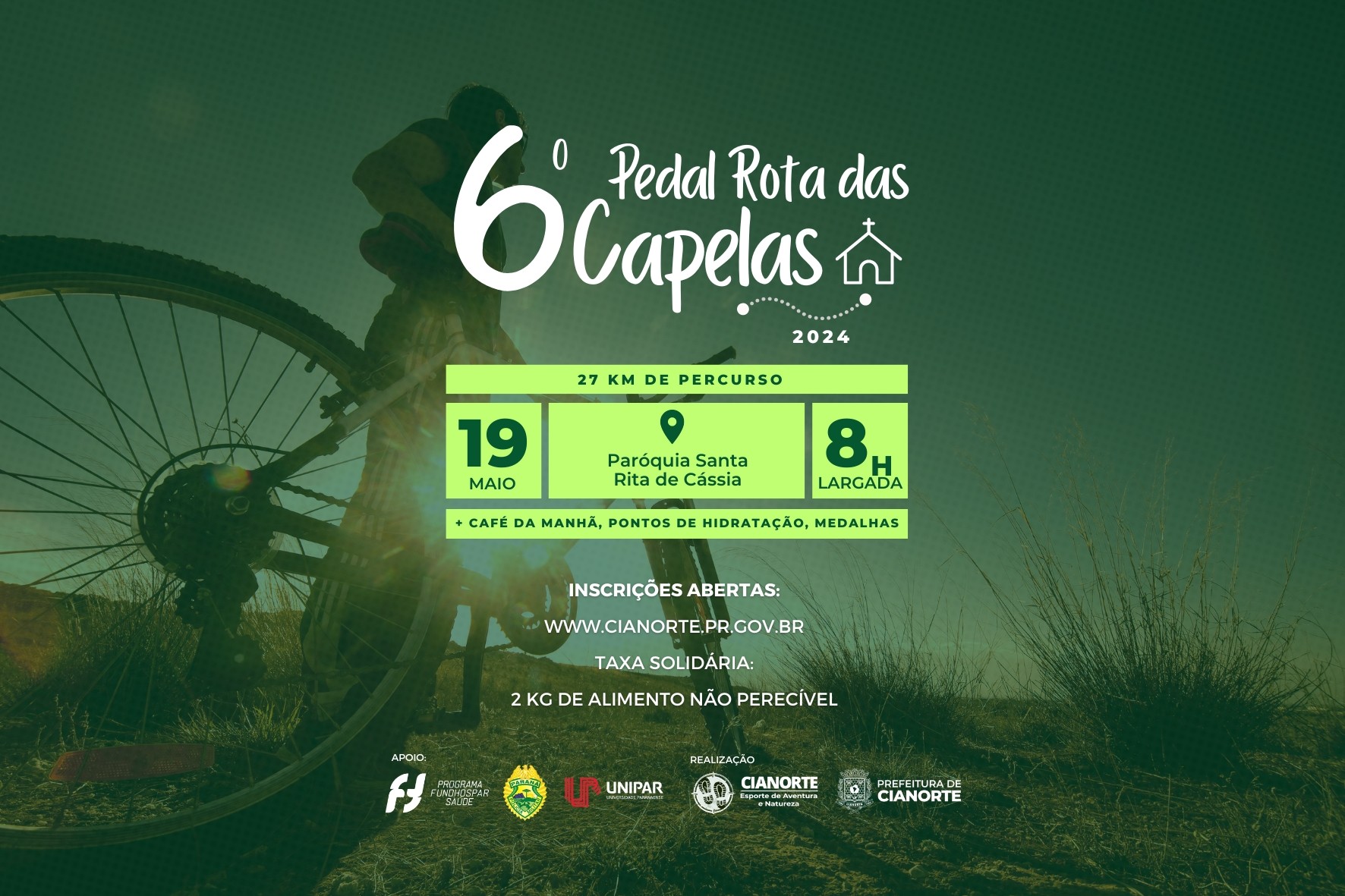 Os ciclistas que apreciam um passeio em meio a natureza, aliado a uma rota turística, não podem ficar de fora do 6º Pedal Rota das Capelas. As inscrições seguem até 17 de maio. A participação é gratuita, mediante taxa solidária, por meio da doação de dois quilos de alimentos não perecíveis, que devem ser entregues no check-in, e serão destinados às ações dos Vicentinos. O cadastro deve ser feito por formulário on-line: https://forms.gle/5T7DmrXRu7BtZqVV9, com acesso pelo banner rotativo do site do Município (www.cianorte.pr.gov.br).