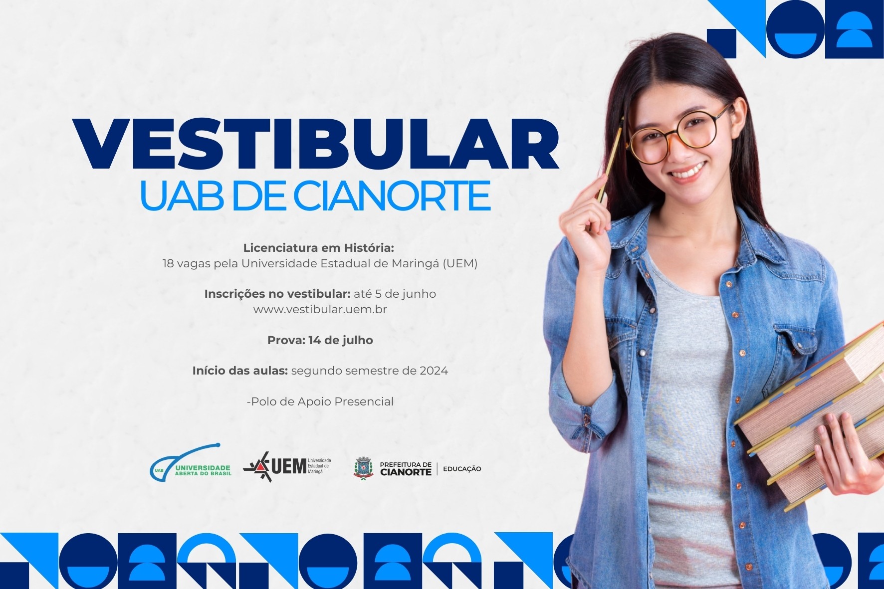 A Universidade Estadual de Maringá (UEM) está com inscrições abertas para o vestibular EAD 2024, para ingresso no segundo semestre deste ano. No total, são 755 vagas para os cursos na modalidade de educação a distância. Em Cianorte, por meio do polo UAB (Programa Universidade Aberta do Brasil), são ofertadas 18 vagas para Licenciatura em História.