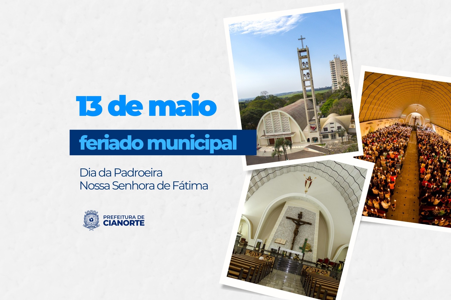 A Capital do Vestuário celebra a padroeira da cidade, Nossa Senhora de Fátima, nesta segunda-feira (13). Com isso, será feriado municipal em Cianorte. Serão mantidos os serviços em saúde da Unidade de Pronto Atendimento (UPA), que funciona 24 horas, e da Farmácia do Setor 04 (Praça Olímpica), com atendimento das 8h às 12h e das 13h às 17h.