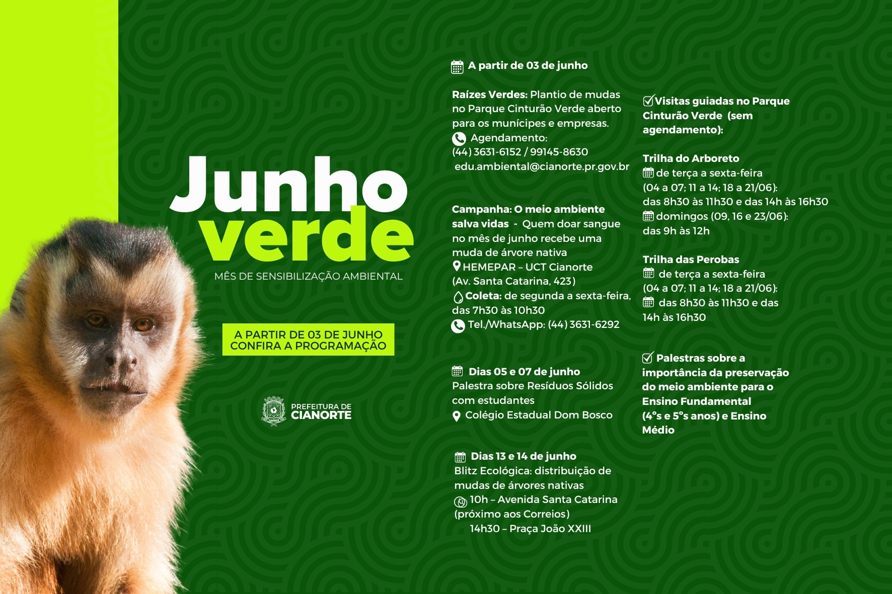 No mês em que se celebra o Dia Mundial do Meio Ambiente (05 de junho), as ações de sensibilização e preservação da natureza terão reforço em Cianorte. Isto porque, a Secretaria Municipal de Meio Ambiente e Bem-Estar Animal, com o apoio de parceiros, preparou uma programação especial para o Junho Verde.