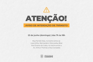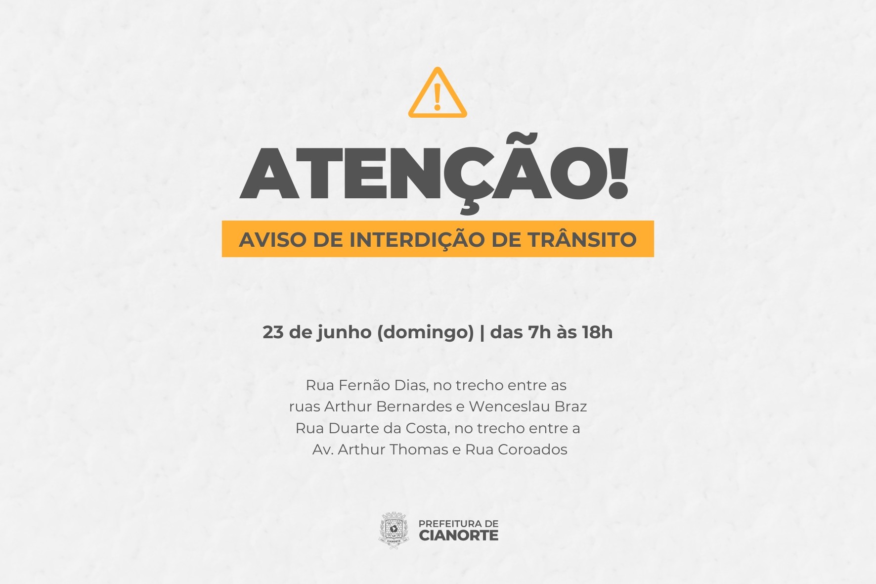 Informamos que, neste domingo (23), das 7h às 18h, haverá interdição de trânsito na Rua Fernão Dias, no trecho entre as ruas Arthur Bernardes e Wenceslau Braz; e na Rua Duarte da Costa, no trecho entre a Av. Arthur Thomas e Rua Coroados. As interdições se fazem necessárias para a realização de serviços de recapeamento asfáltico.
