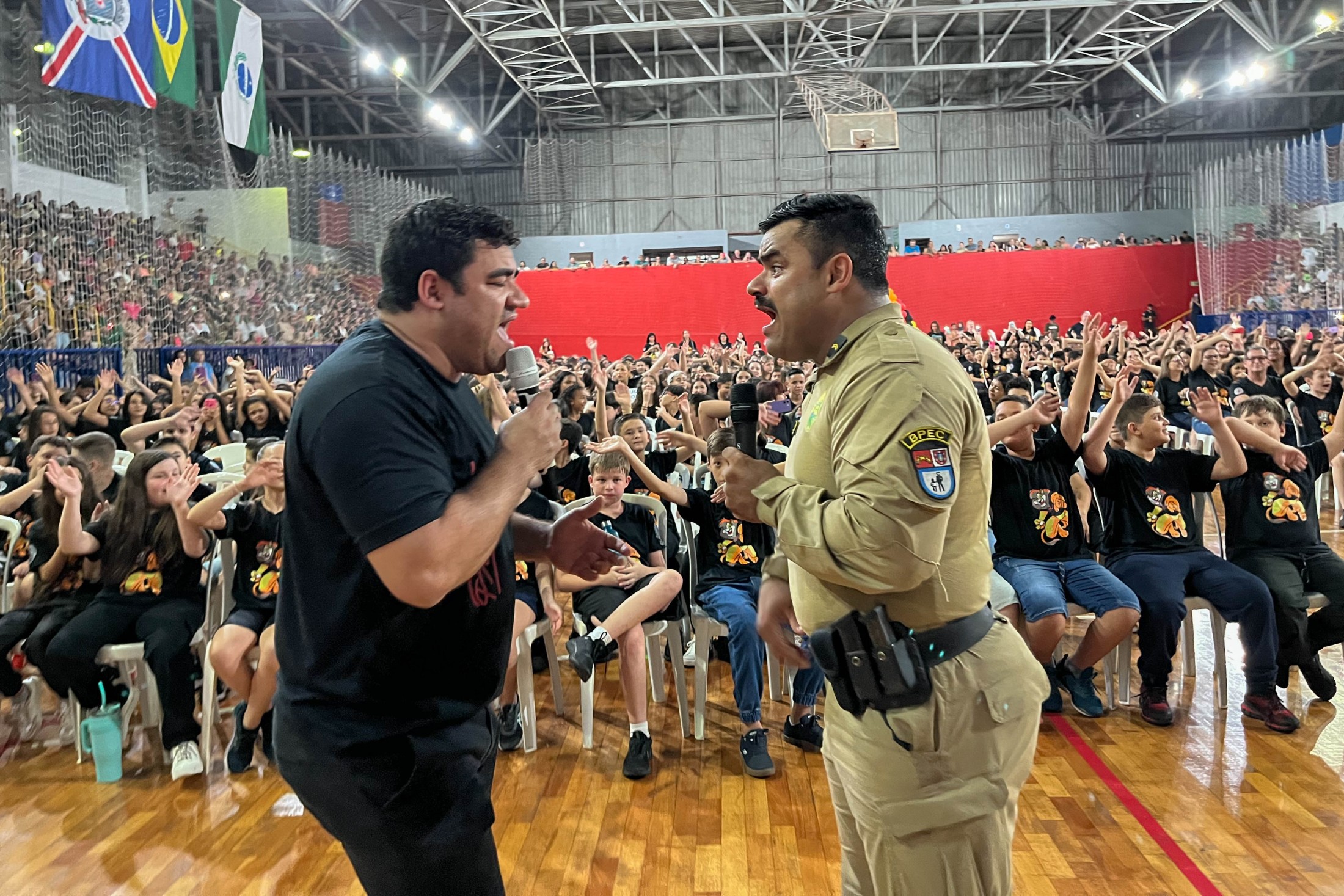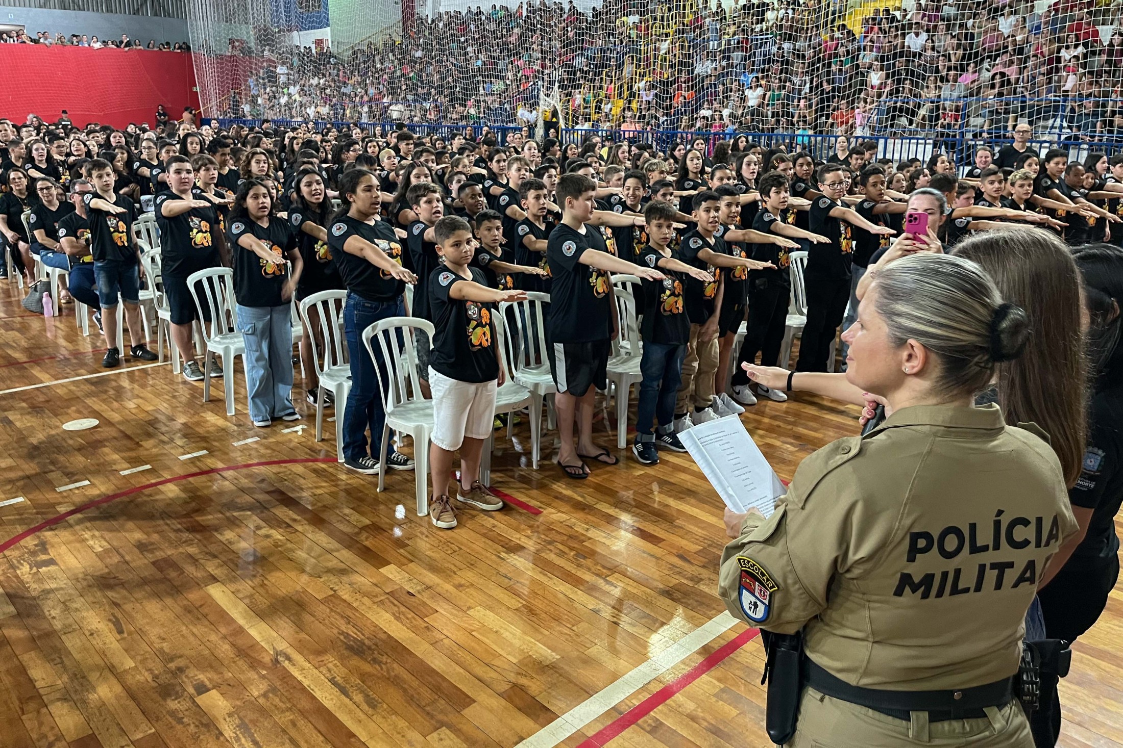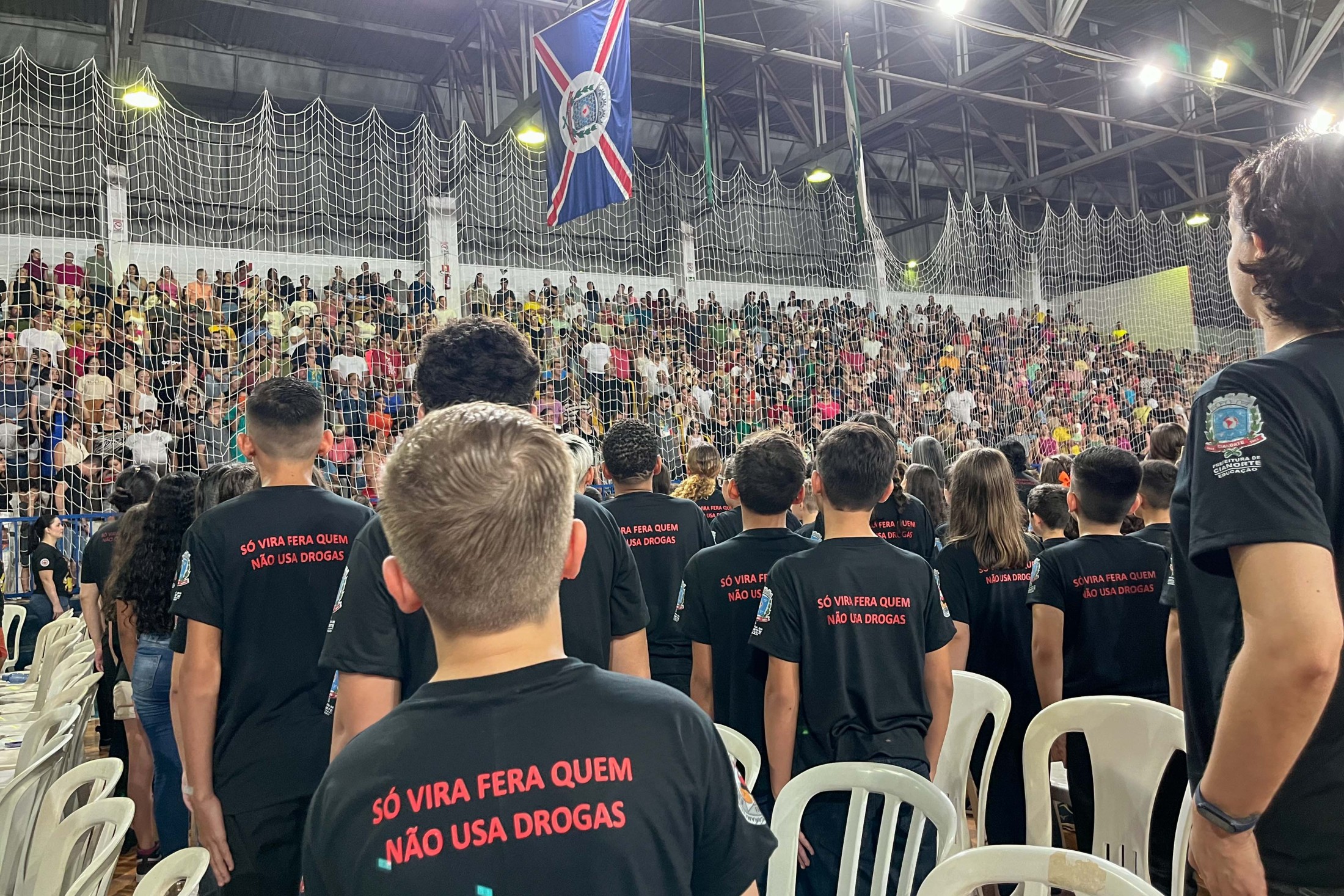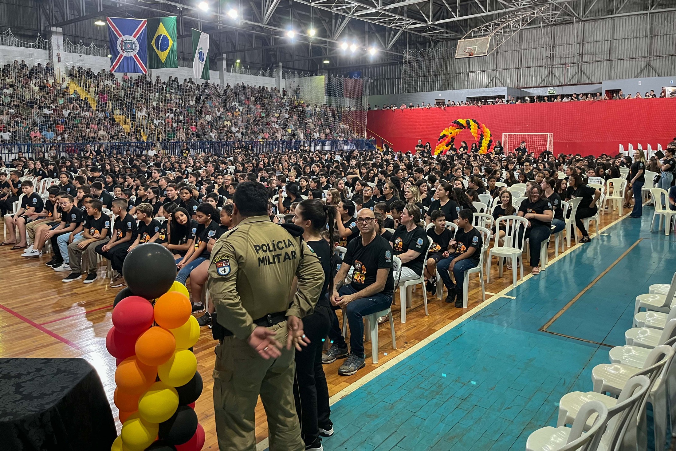 Emoção e alegria marcaram a solenidade de formatura do Programa Educacional de Resistência às Drogas e à Violência – Proerd, realizada na noite da última quinta-feira (17), no Ginásio de Esportes Tancredo Neves (Tancredão). O evento reuniu mais de 3 mil pessoas, entre autoridades, militares, profissionais da educação, familiares e, aproximadamente, 870 estudantes do 5º ano do Ensino Fundamental, das 15 escolas da rede municipal de ensino, participantes do programa.