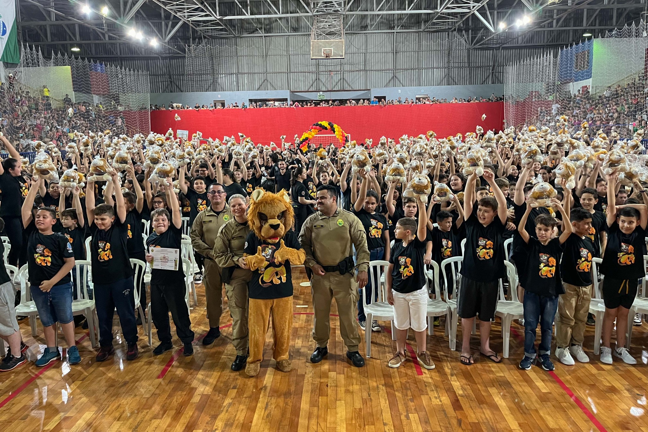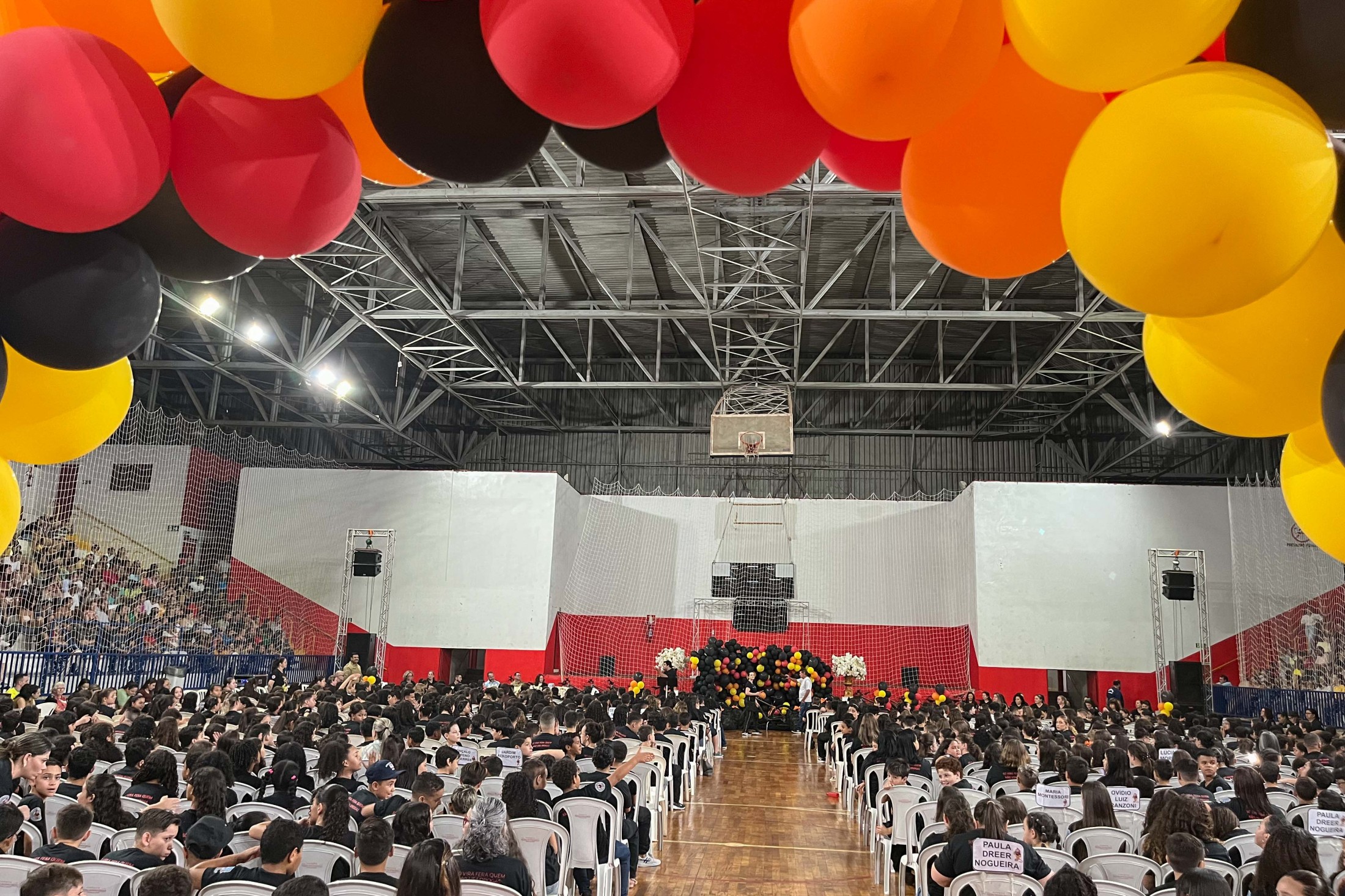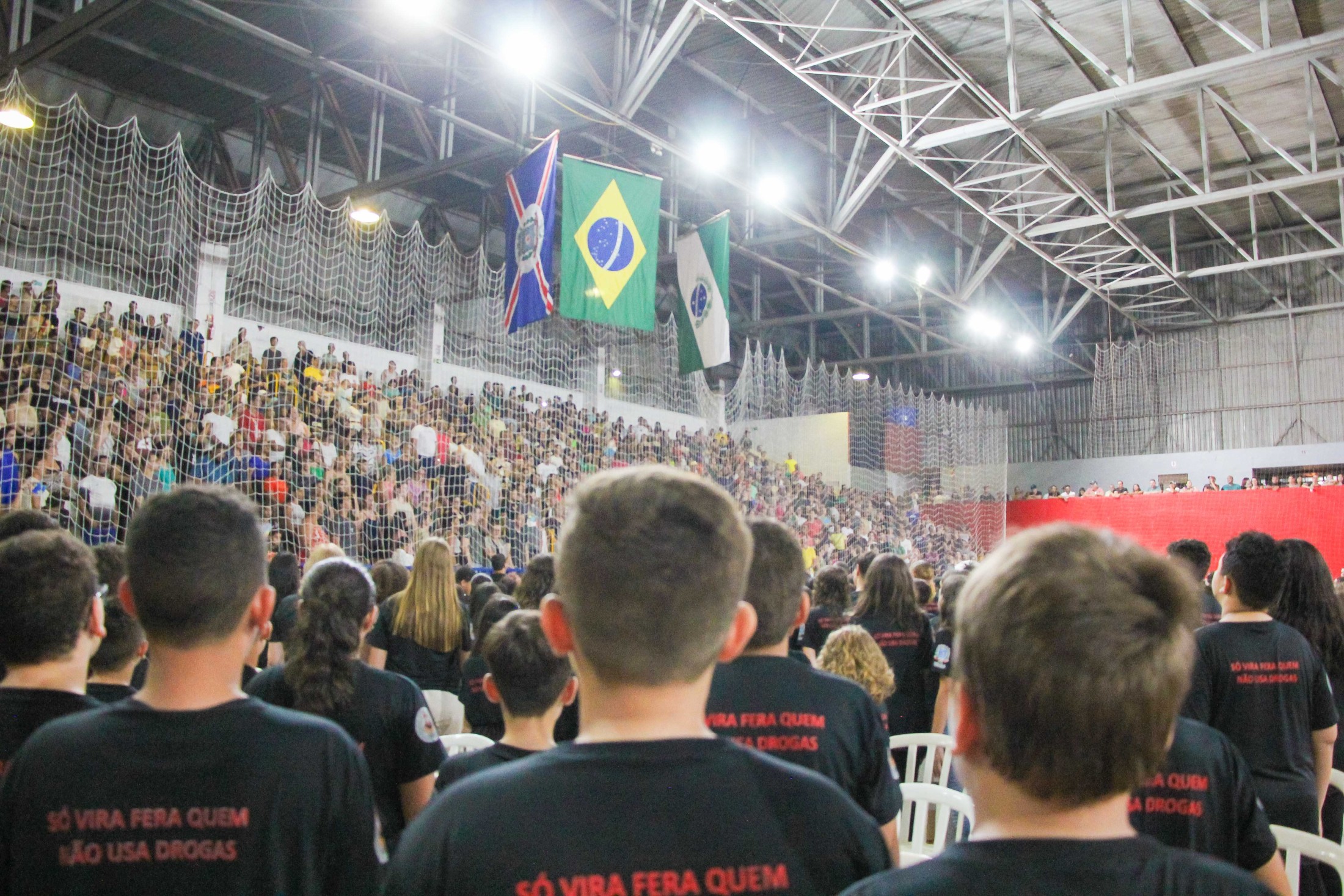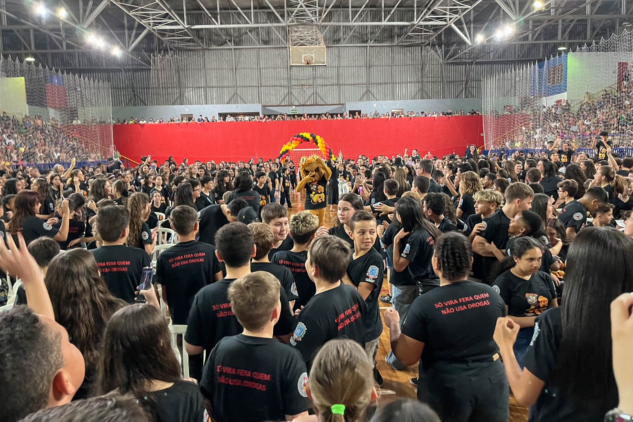 Emoção e alegria marcaram a solenidade de formatura do Programa Educacional de Resistência às Drogas e à Violência – Proerd, realizada na noite da última quinta-feira (17), no Ginásio de Esportes Tancredo Neves (Tancredão). O evento reuniu mais de 3 mil pessoas, entre autoridades, militares, profissionais da educação, familiares e, aproximadamente, 870 estudantes do 5º ano do Ensino Fundamental, das 15 escolas da rede municipal de ensino, participantes do programa.