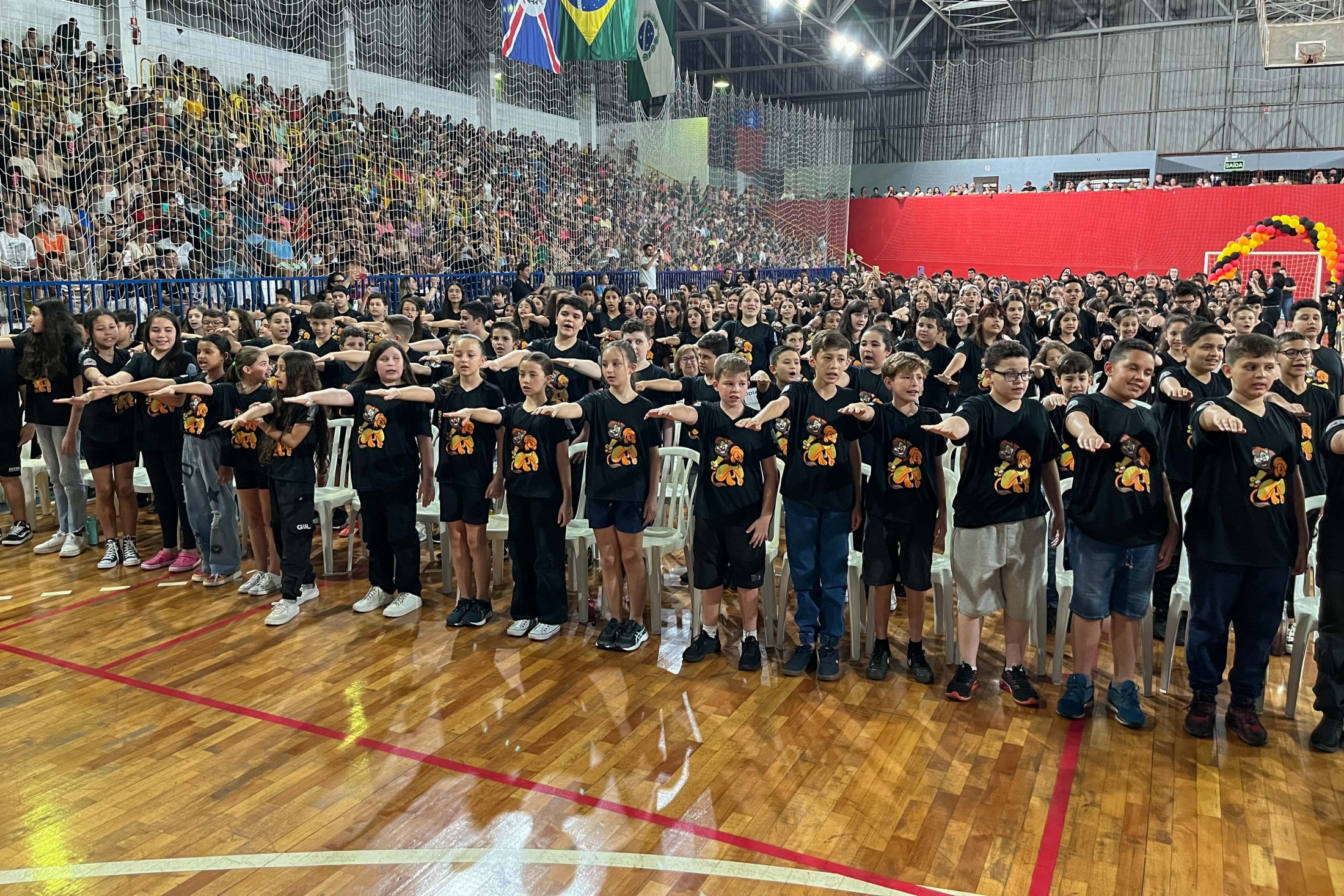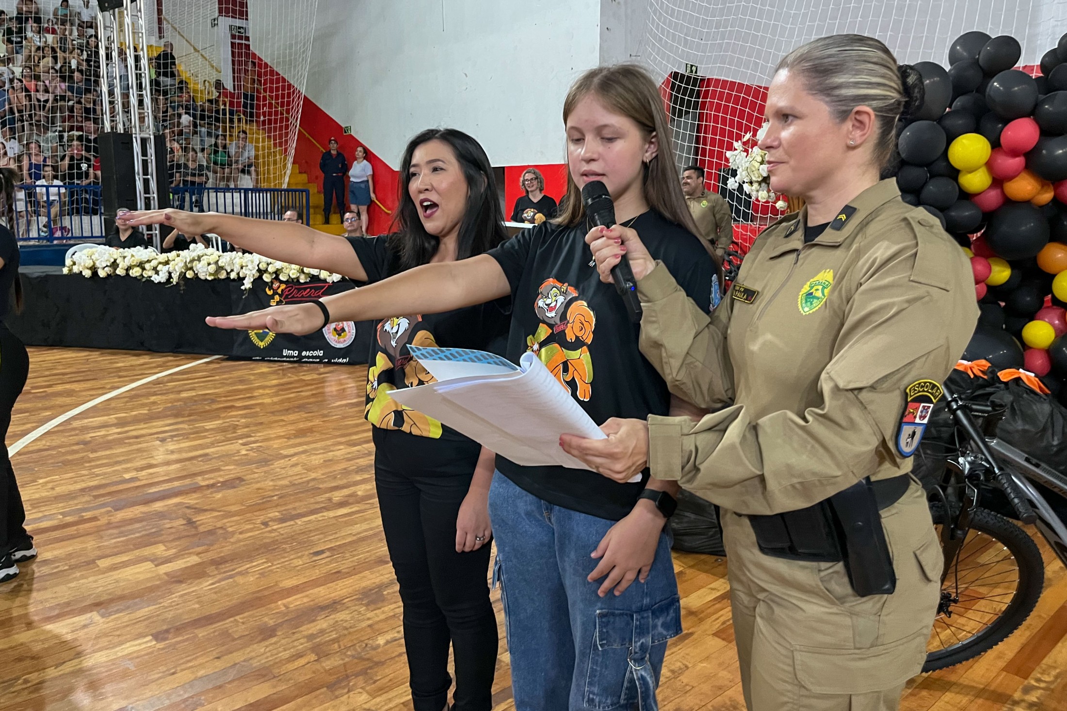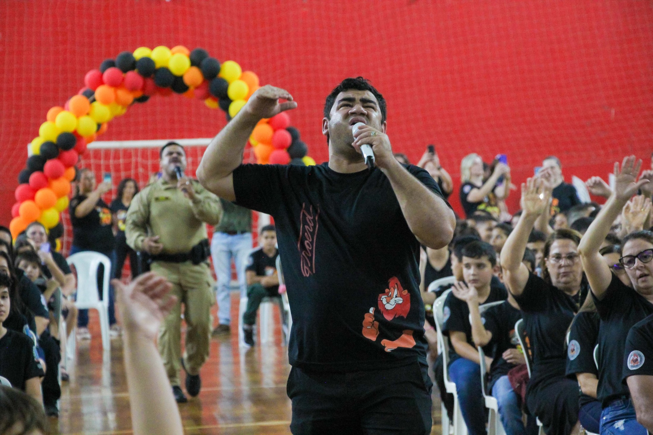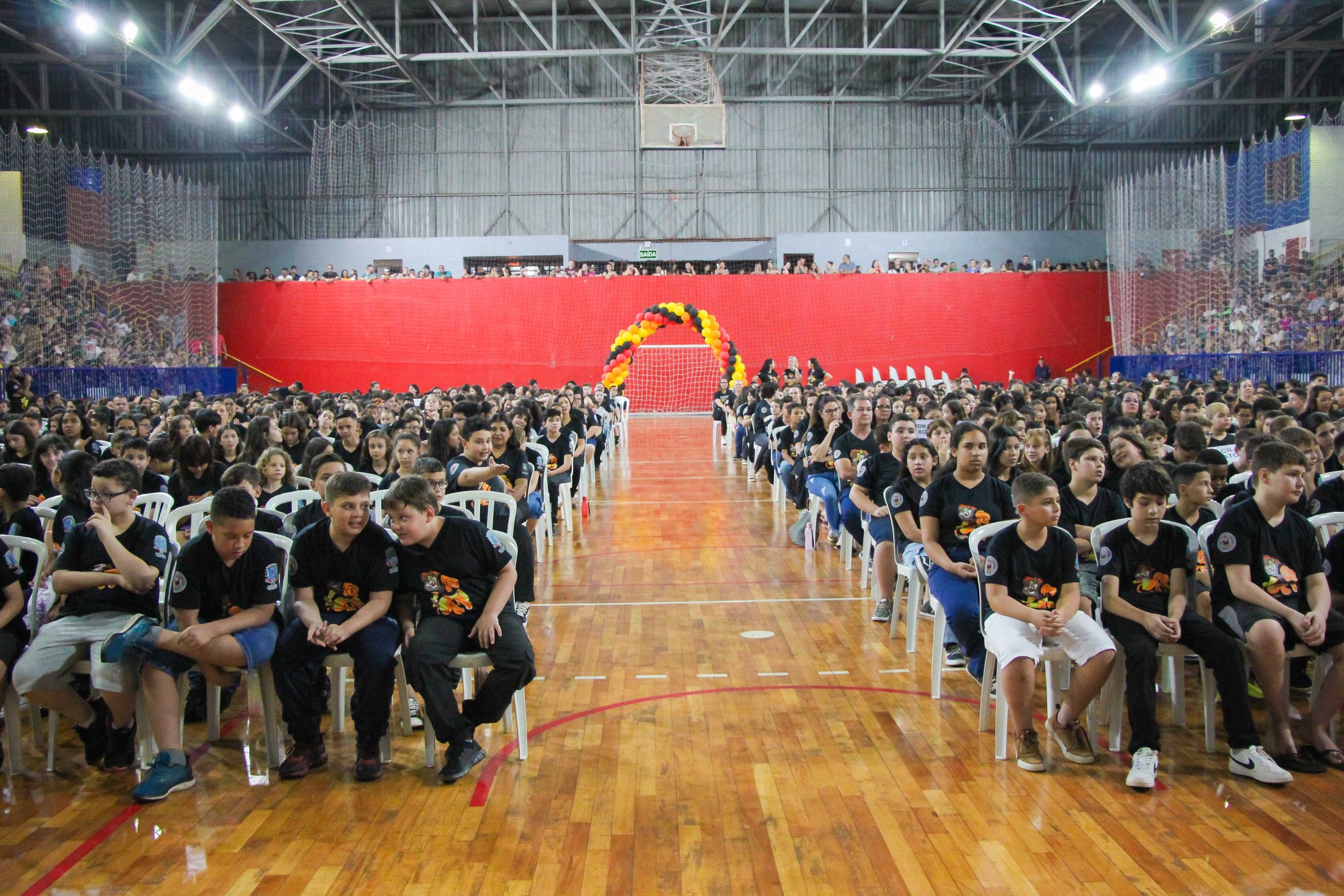 Emoção e alegria marcaram a solenidade de formatura do Programa Educacional de Resistência às Drogas e à Violência – Proerd, realizada na noite da última quinta-feira (17), no Ginásio de Esportes Tancredo Neves (Tancredão). O evento reuniu mais de 3 mil pessoas, entre autoridades, militares, profissionais da educação, familiares e, aproximadamente, 870 estudantes do 5º ano do Ensino Fundamental, das 15 escolas da rede municipal de ensino, participantes do programa.