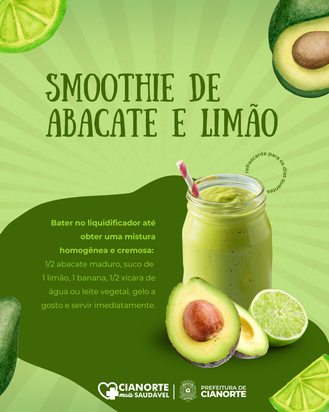 Bater no liquidificador até obter uma mistura homogênea e cremosa: 1/2 abacate maduro, suco de 1 limão, 1 banana, 1/2 xícara de água ou leite vegetal, gelo a gosto e servir imediatamente.