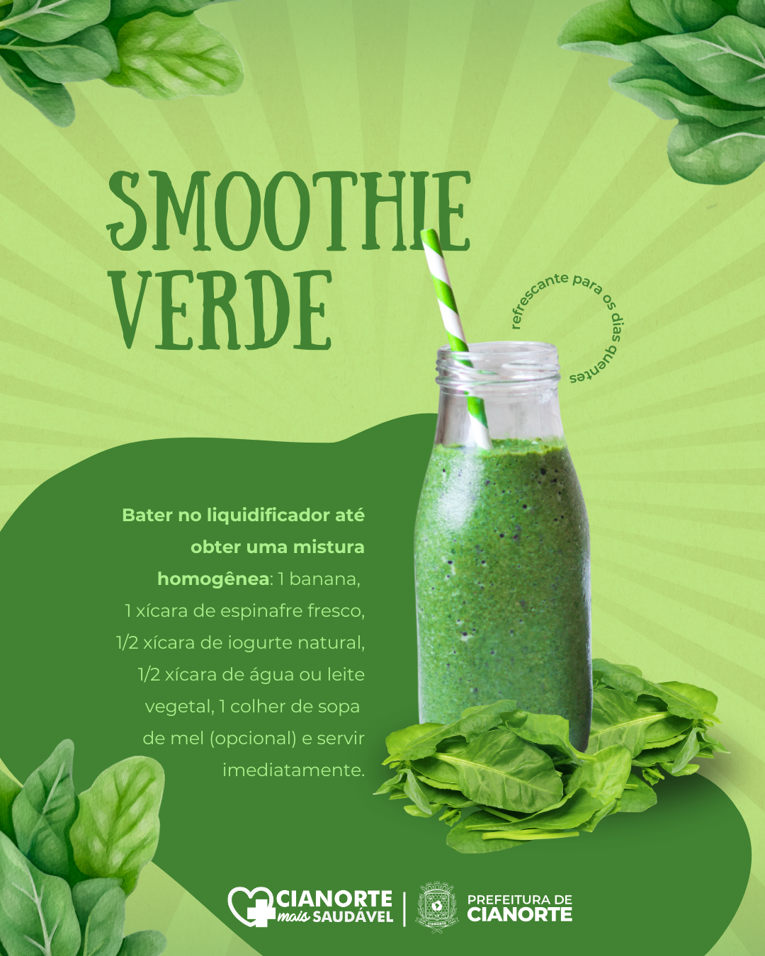 Bater no liquidificador até obter uma mistura homogênea: 1 banana, 1 xícara de espinafre fresco, 1/2 xícara de iogurte natural, 1/2 xícara de água ou leite vegetal, 1 colher de sopa de mel (opcional) e servir imediatamente.