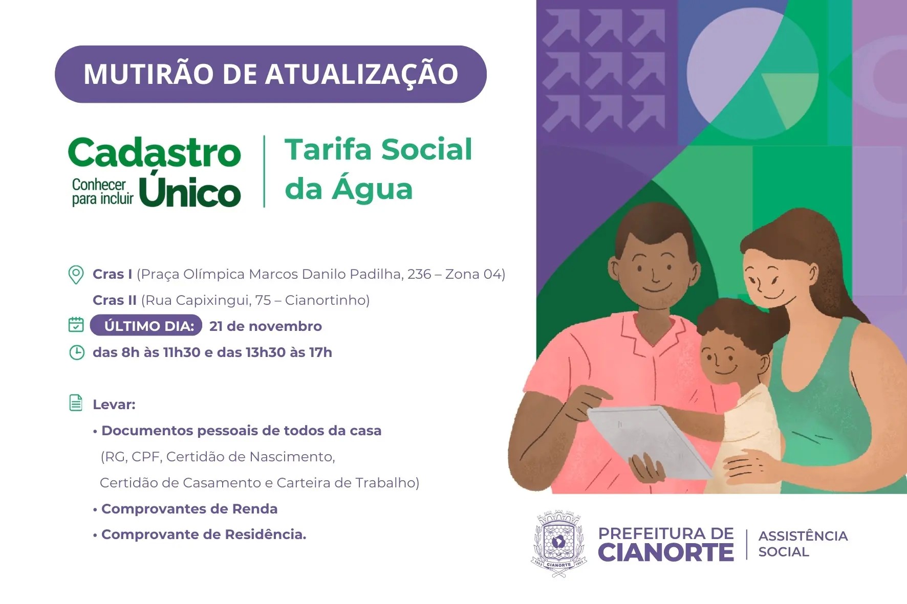 As equipes da Secretaria Municipal de Assistência Social estarão apostos, nesta quinta-feira (21), para o último dia do mutirão de atualização dos cadastros de pessoas ou famílias inscritas no Cadastro Único (CadÚnico) e Tarifa Social da Água (Programa Água Solidária). São convocadas a comparecer aquelas cuja atualização ou inscrição é igual ou superior a dois anos. Em Cianorte, dos 8.913 cadastros, 2515 precisam ser atualizados.