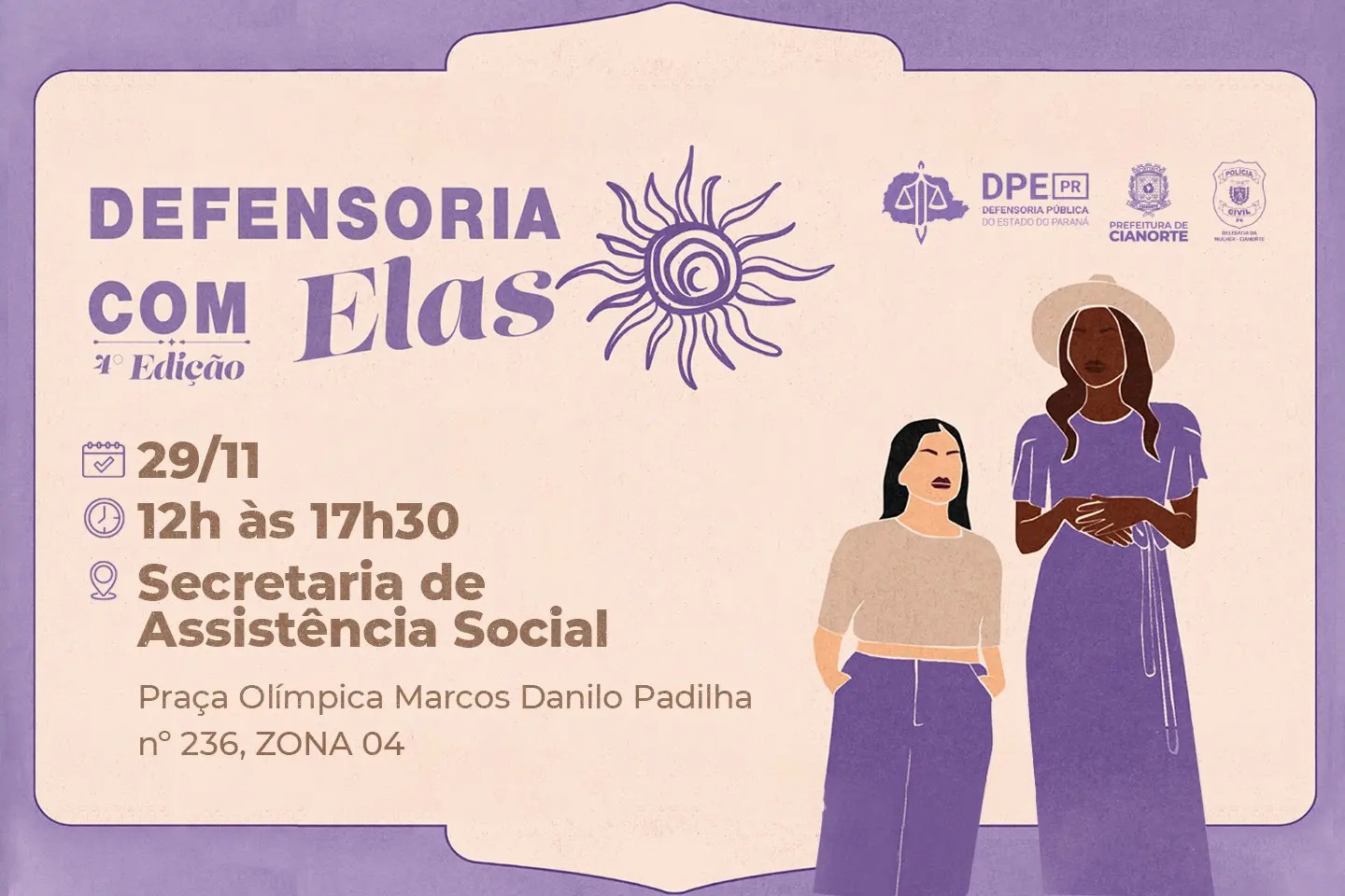 O projeto da Defensoria Pública do Estado do Paraná (DPE-PR), “Defensoria com Elas”, será realizado pela primeira vez em Cianorte. A ação será nesta sexta-feira (29), das 12h às 17h30, na Secretaria Municipal de Assistência Social (Praça Olímpica Marcos Danilo Padilha, 236). O foco será o atendimento de mulheres em demandas da área de Família, como casos de divórcio, dissolução de união estável e regulamentação de guarda, visita e pensão alimentícia.