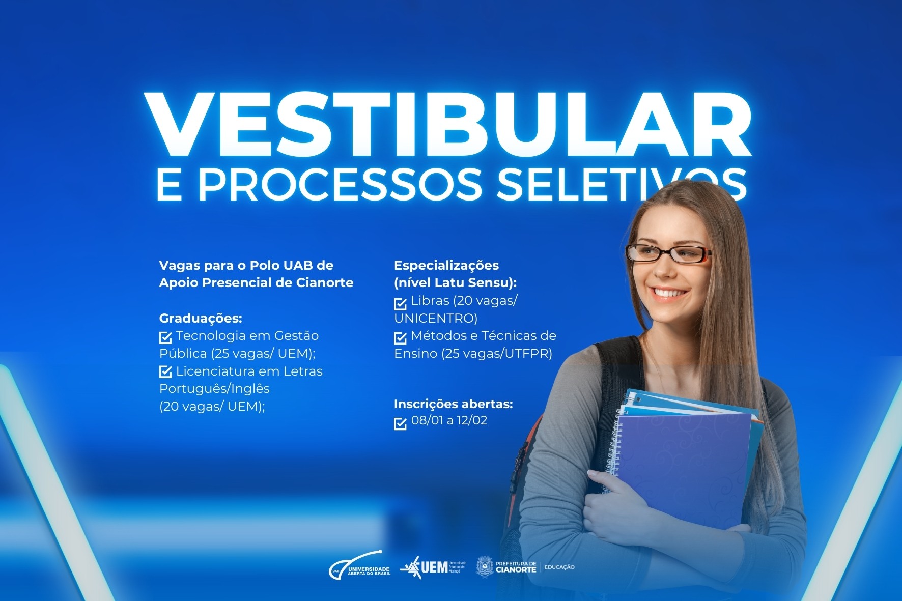Os cianortenses interessados em ingressar no ensino superior público e gratuito, na modalidade de Educação a Distância (EAD), têm a oportunidade com os cursos do Sistema Universidade Aberta do Brasil (UAB), ofertados no município pela parceria entre a Prefeitura e instituições de renome, como a Universidade Estadual de Maringá (UEM); Universidade Estadual do Centro-Oeste (UNICENTRO); e Universidade Tecnológica Federal do Paraná (UTFPR). As inscrições para os vestibulares e processos de seleção já estão abertas.