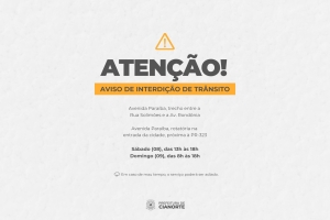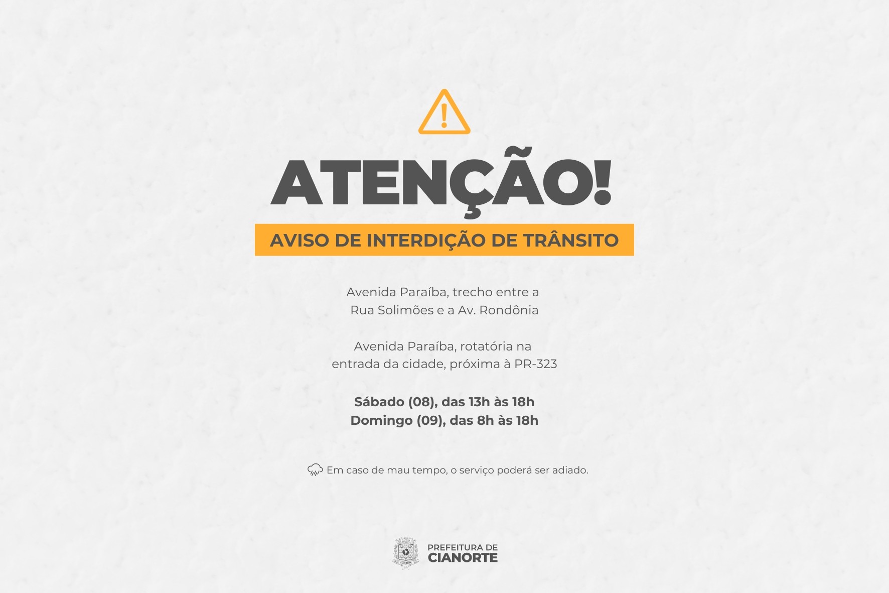 A Prefeitura informa que haverá interdição de trânsito na Avenida Paraíba, trecho entre a Rua Solimões e a Av. Rondônia; e na rotatória da Av. Paraíba, localizada na entrada da cidade, próxima à PR-323, neste sábado (08), das 13h às 18h, e domingo (09), das 8h às 18h. A medida se faz necessária para a realização de obras de recuperação da pavimentação asfáltica.