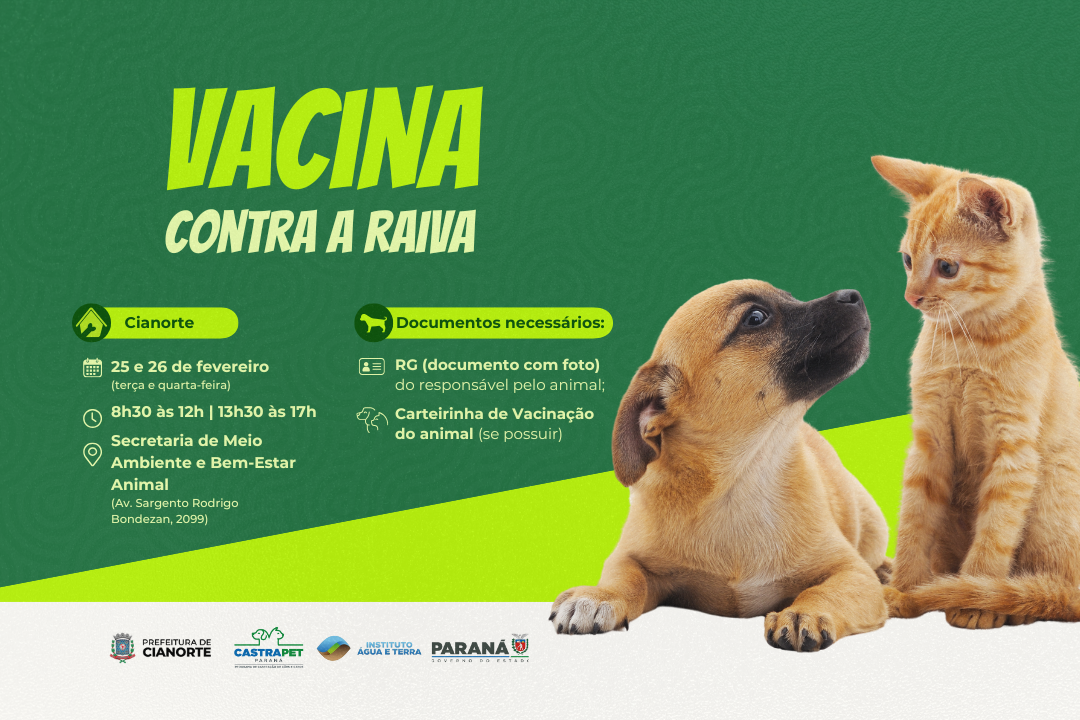 Os proprietários de cães e gatos de Cianorte têm a oportunidade de imunizar seu pet contra a raiva, gratuitamente. A ação de vacinação será na terça e quarta-feira (dias 25 e 26 de fevereiro), das 8h30 às 12h e das 13h30 às 17h, na sede da Secretaria Municipal de Meio Ambiente e Bem-Estar Animal (Av. Sargento Rodrigo Bondezan, 2099).