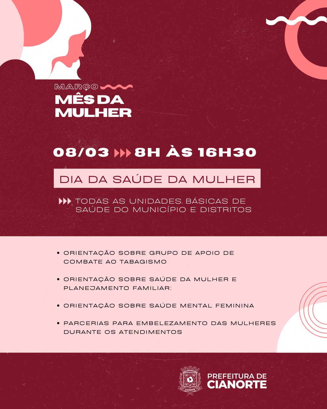 A agenda alusiva ao Mês da Mulher segue até o dia 31 de março, com aulão de funcional (11/03); Conexão Mulheres e Cianorte Tem Emprego Edição Mulher (13/03); 1ª Conferencia Municipal de Políticas Públicas para Mulheres (17/03); aulão de Defesa Pessoal (18/03); aulão de yôga (25/03); e Assembleia de Posse da nova composição do Conselho Municipal dos Direitos da Mulher (CMDM) para o biênio de 2025/2027 (31/03).