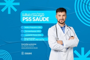 Termina nesta sexta-feira (14) o prazo de inscrição do Processo Seletivo Simplificado (PSS) para a contratação temporária de médico psiquiatra (20h), psicopedagogo (40h) e assistente social (30h). Os cadastros são gratuitos e podem ser realizados mediante preenchimento do formulário disponível no banner rotativo, no site do Município (www.cianorte.pr.gov.br), e anexação dos documentos comprobatórios.