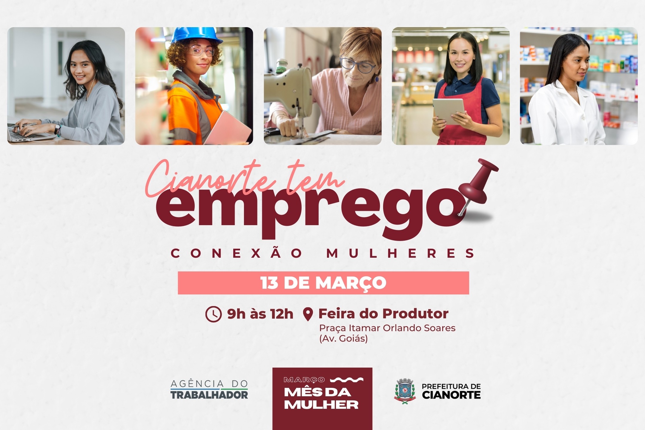 A agenda de atividades alusivas ao Mês da Mulher, voltadas para o empoderamento, saúde e bem-estar feminino, segue nesta quinta-feira (13), com o Conexão Mulheres e o Cianorte Tem Emprego Edição Mulher, das 9h às 12h, na Praça Itamar Orlando Soares (Feira do Produtor). Para participar, não é necessário agendamento. Basta comparecer ao local com documentos pessoais (RG e CPF) e a Carteira de Trabalho.