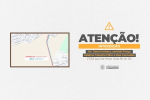 Informamos que, nesta quinta-feira (27), haverá uma interdição de trânsito na Avenida Genei Uehara, sentido Praça Adelino Teixeira Filho a Rua Coroados, das 9h às 12h, para a realização de corte de galhos que estão com risco de queda.